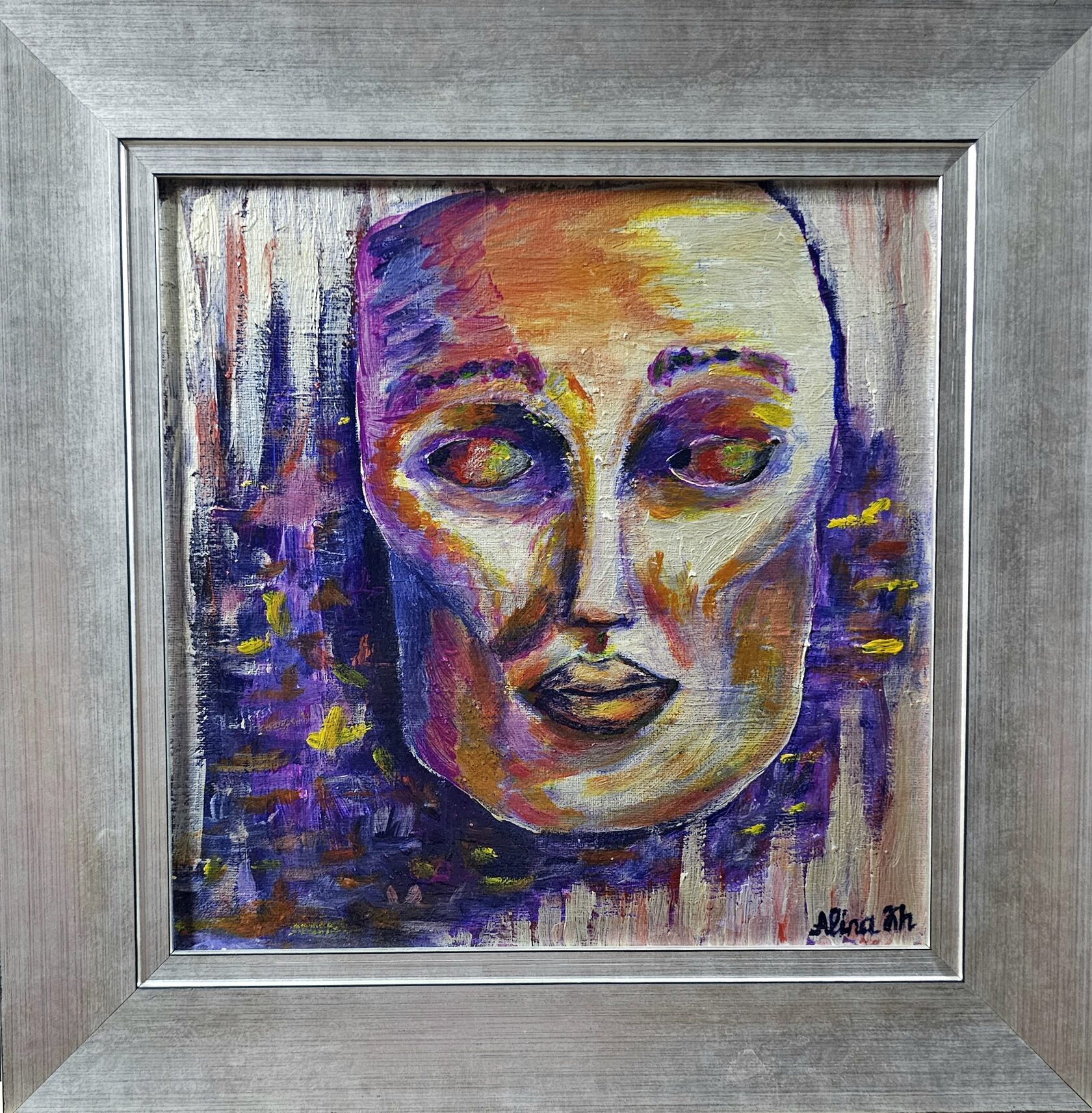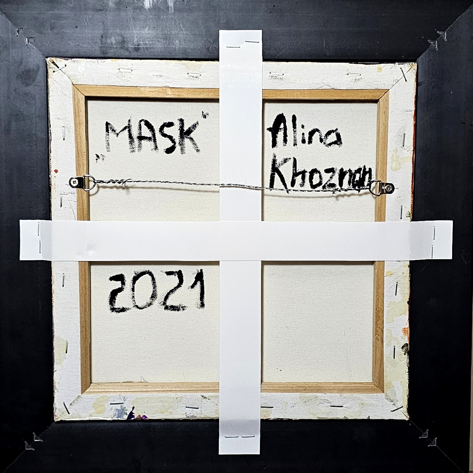 Year of creation: 2021 Varnished and framed. Acrylics on cotton canvas. Size with frame 40.5 cm x 40.5 cm. Size without frame 30 cm x 30 cm. Signed with acrylics upward and backward. The painting "Mask" is an allegory painting. We live in a world where social pressure is at its peak. In order to fit into society and not become an outcast, many are forced to change their behavior, beliefs, interests, and desires to fit the conventional framework. Some take off this so-called “mask” in front of their loved ones, friends, partners, showing their true inner world, while for others the mask has become an integral part of their life and marked for them the loss of their individuality. This picture shows us that behind this very mask we will not be able to see its owner. The color palette of the painting was not chosen by chance: the predominantly cold background reflects how a person continuously wearing a mask sees the world around him, his emotional state, and the warm colors “emitted” by the wearer himself are the very source of happiness that he can achieve if he finds himself. The allegory of the mask as a symbol of hidden emotions and internal conflicts allows the viewer to come into contact with the theme of identity, social pressure and loss of individuality. The choice of a cool palette for the background and warm colors for the mask effectively conveys the spiritual and emotional state of the person suffering from wearing the mask, and encourages awareness and search for one's true self.