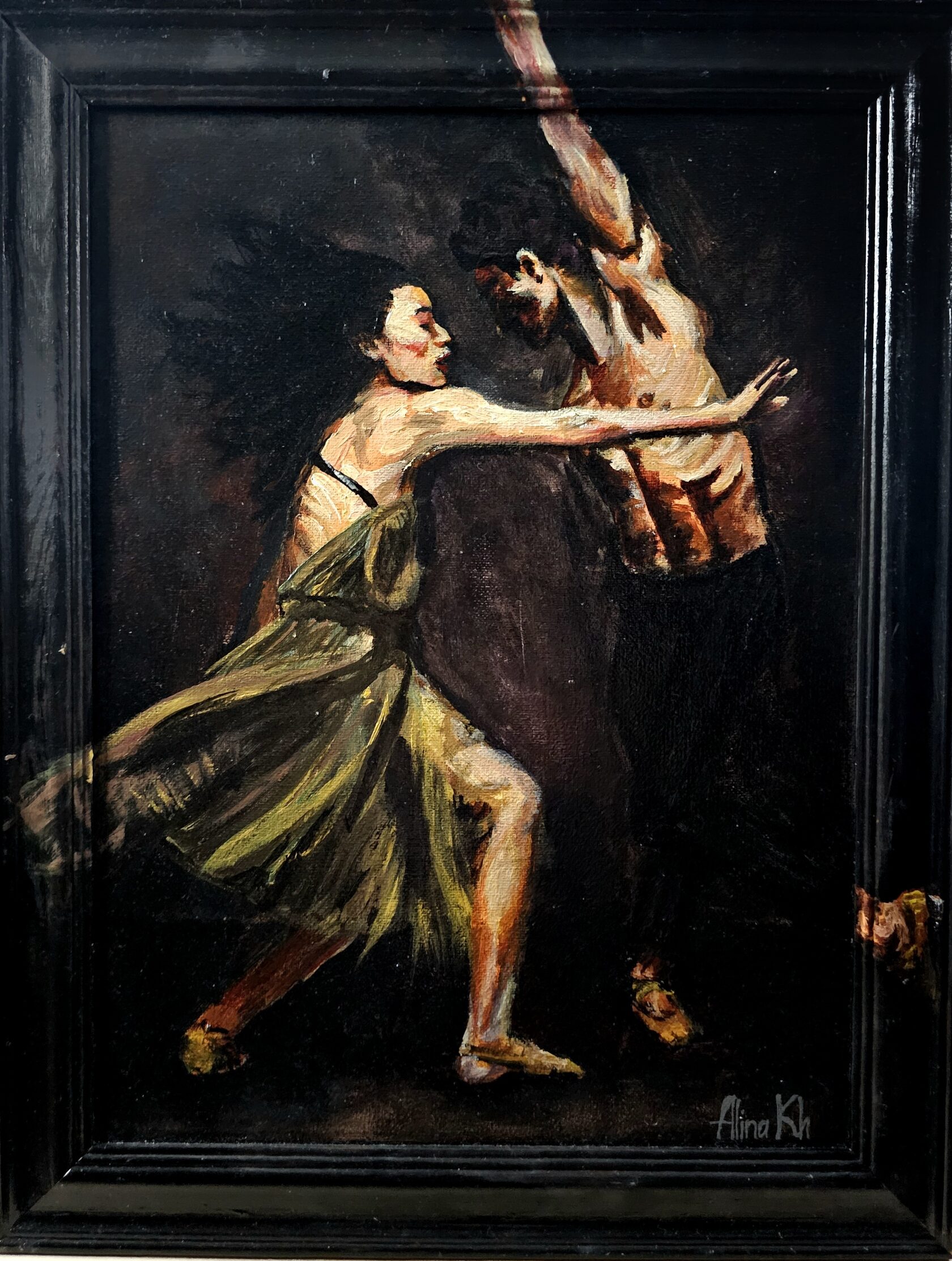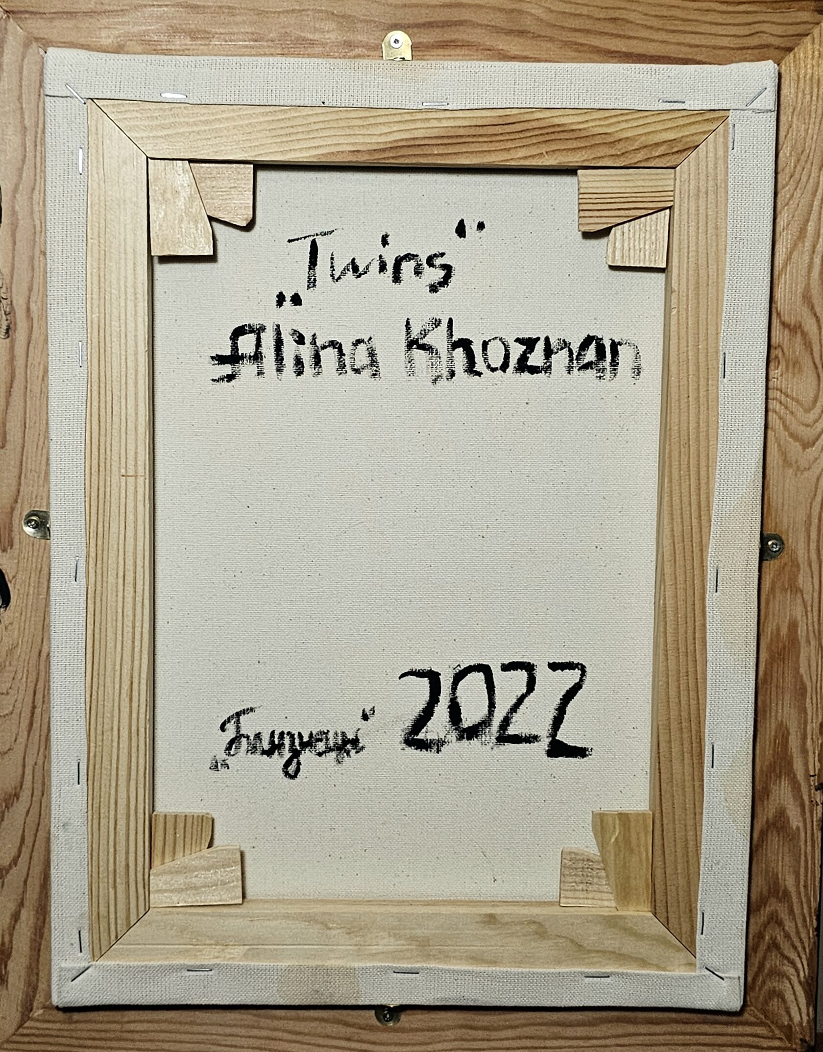 Year of creation: 2022 Framed. Varnished. Acrylics on cotton canvas. Size with frame 37 cm x 46 cm. Size without frame 30 cm x 40 cm. Signed with acrylics upward and backward. The painting "Twins" symbolizes the inner struggle and spiritual diversity of every person. The two dancers represent two sides of one person's personality that compete or collaborate with each other. The dance on a black background represents the internal conflict that occurs within each of us. The black background emphasizes the atmosphere of mystery and mystery, and also indicates that the inner world of a person is often full of secrets and unexplored depths. The dancers' expressive movements reflect the complexity of human nature and the constant struggle between opposing parts of the personality. The warm color palette is designed to enhance the emotional and empathic connection with the viewer. It symbolizes warmth and humanity, giving the painting a more intimate and soulful character. Warm colors are associated with energy and passion, which emphasizes the dynamics and intensity of the dance performance. The color palette used emphasizes the atmosphere of unity and harmony between the two sides of the personality depicted in the paintings. Along with the aforementioned internal conflict, this also indicates an internal struggle for self-understanding and integrity. The use of warm colors shows the central theme of internal dialogue and self-discovery presented in the paintings. This creates an atmosphere of intimacy and humanity, inviting the viewer to introspect and reflect on their own inner world. Thus, the palette of the painting complements and deepens the idea of the work, creating a warm and attractive emotional atmosphere for the viewer to perceive The author strives to evoke in the viewer reflection that each person consists of different aspects of personality, which can be both contradictory and interconnected. Dance becomes a metaphor for the internal struggle and search for harmony between these aspects.