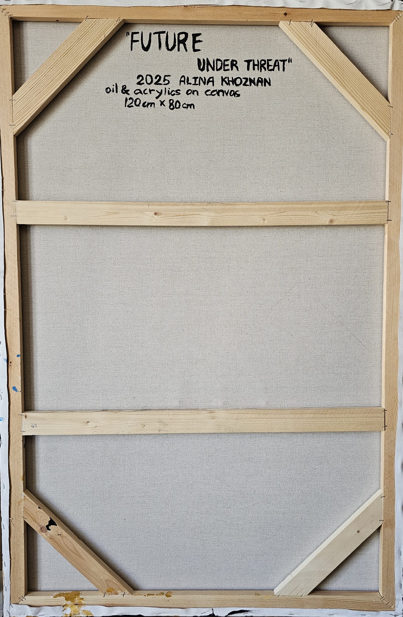 In the center of 'Future Under Threat', in the form of a young girl, a beautiful, untouched landscape unfolds — a vision of the living nature that exists within every human being. This central image invites us to remember that each of us is inseparably part of nature itself, and with it comes the duty to preserve our world for future generations.