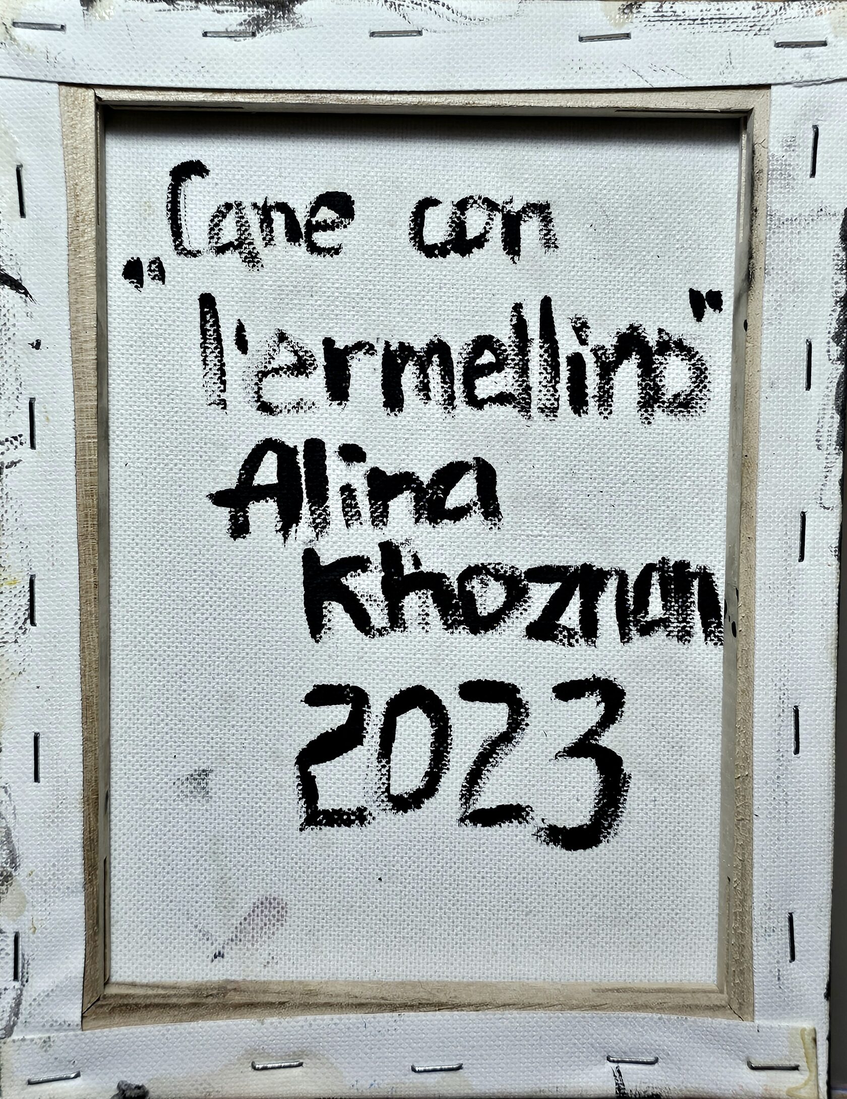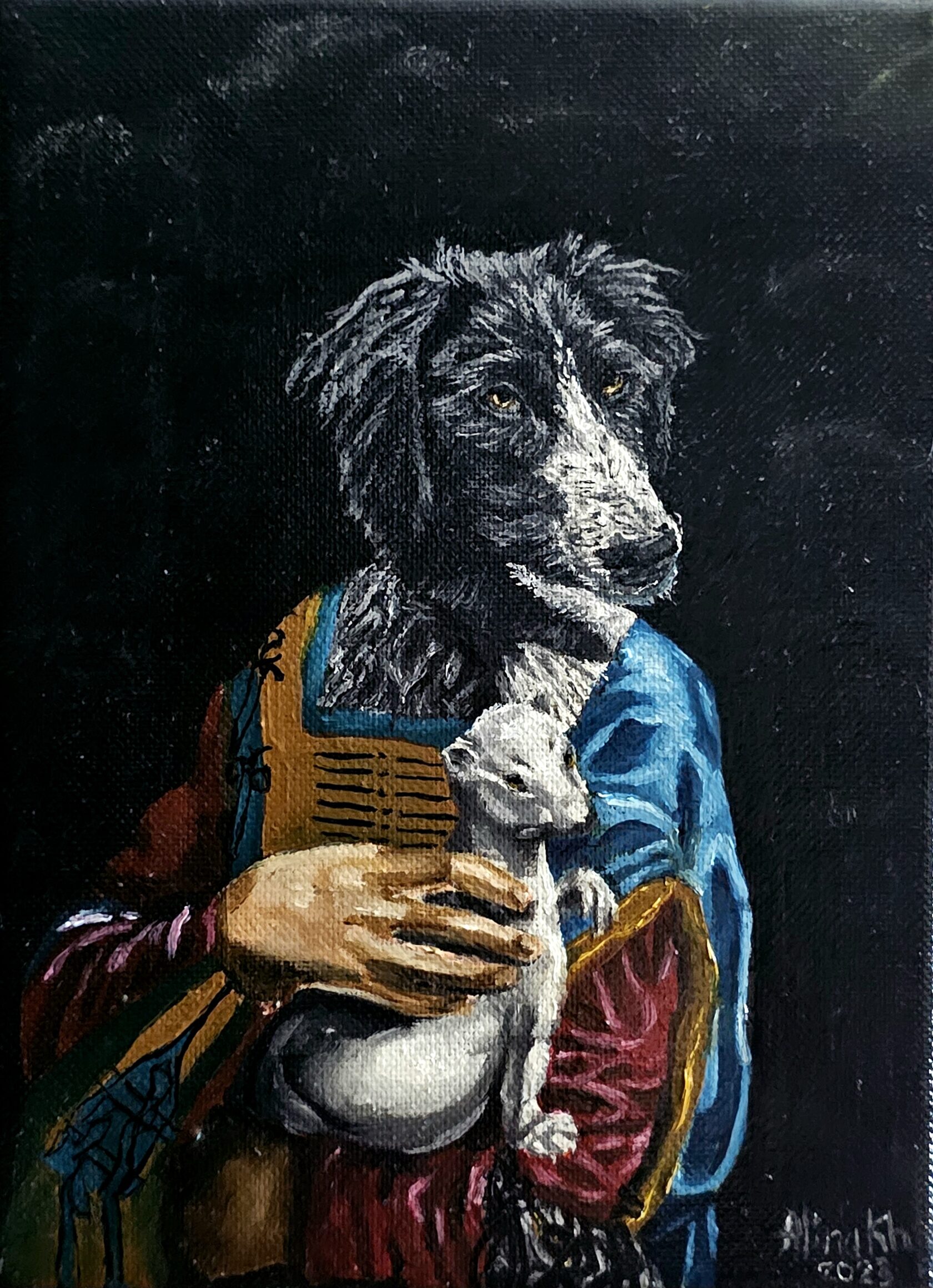 Year of creation: 2023 Varnished. Oil on cotton canvas. Size 18 cm x 24 cm. Signed with oil upward and with acrylics backward. The painting shows a dog in a pose and composition similar to the original Lady with an Ermine portrait. She is depicted with a sublime expression and pose that imitates the original portrait. A parody of the famous painting "The Lady with an Ermine" emphasizes the concept of playing with classical images and addressing them with humor and irony. In this work, the artist comments on art in general, pointing out its susceptibility to fashion, changing tastes and the perception of beauty. The image of a dog instead of an aristocratic lady also evokes the idea that true beauty does not depend on social status or external attributes, but can be found in unexpected places. The palette used in the parody is chosen to reflect the style and tone of the original work, while still adding an element of play and fun. The work uses color combinations that are both bright and saturated, which emphasizes the dog’s facial expression, and muted, which creates an atmosphere of elegance and mystery characteristic of the original portrait.
