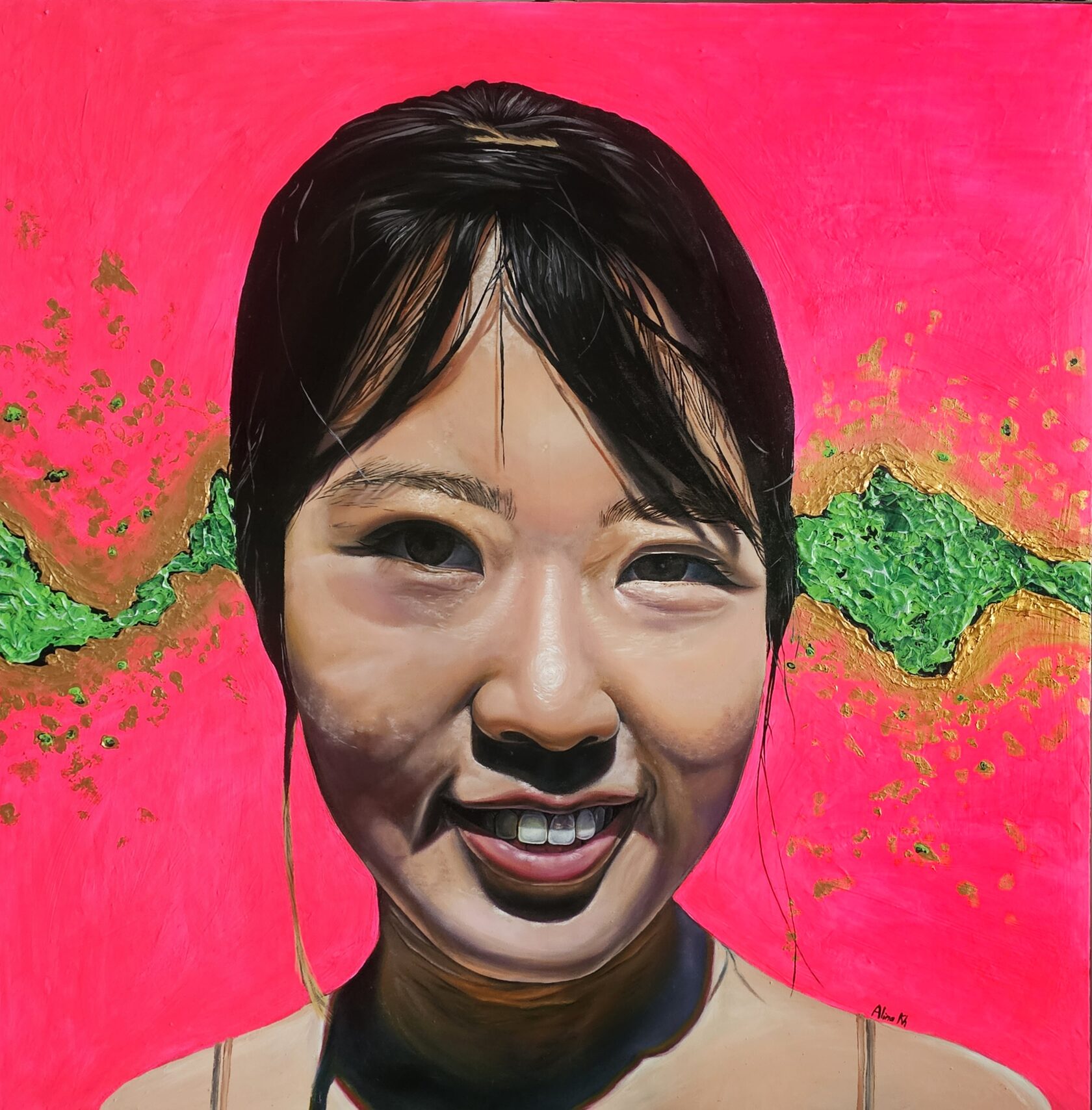 Year of creation 2025 Acrylics, oil on canvas. Varnished. Size 100 x 100 x 2 cm. Description: Inner and Outer is a series of paintings inspired by real people I meet while traveling. In this project, I explore the contrast between a person’s visible appearance and their unseen inner world as I intuitively perceive it. The central figure in each work is a hyperrealistic portrait that represents the outer world — the physical presence, the face others see. Surrounding and intersecting this portrait is the inner world — an abstract, atmospheric space that reflects the person’s aura, emotions, energy, and inner experiences, as if their inner reality were made visible. I met her in Taiwan while hiking on Xiangshan (Elephant Mountain). It was one of those quiet, unplanned encounters that stay with you longer than expected. She was warm, open, and incredibly kind, and our conversation unfolded naturally as we walked, surrounded by the city and nature at the same time. I was drawn not only to her appearance, but to her inner world.
