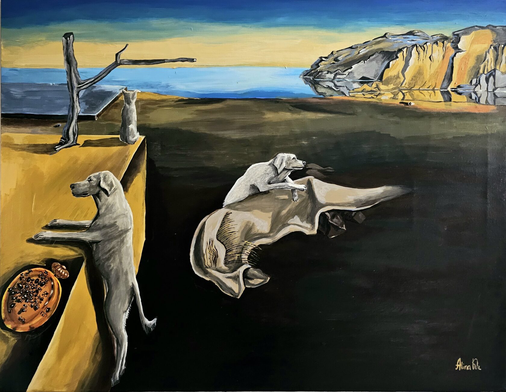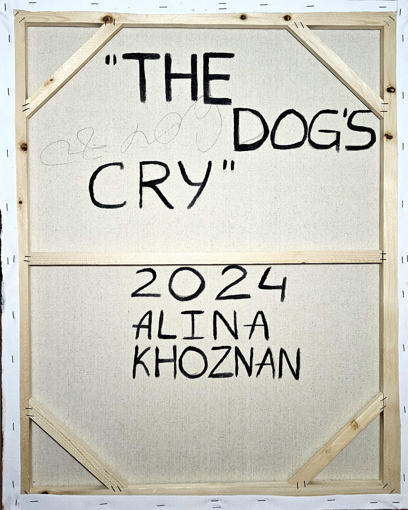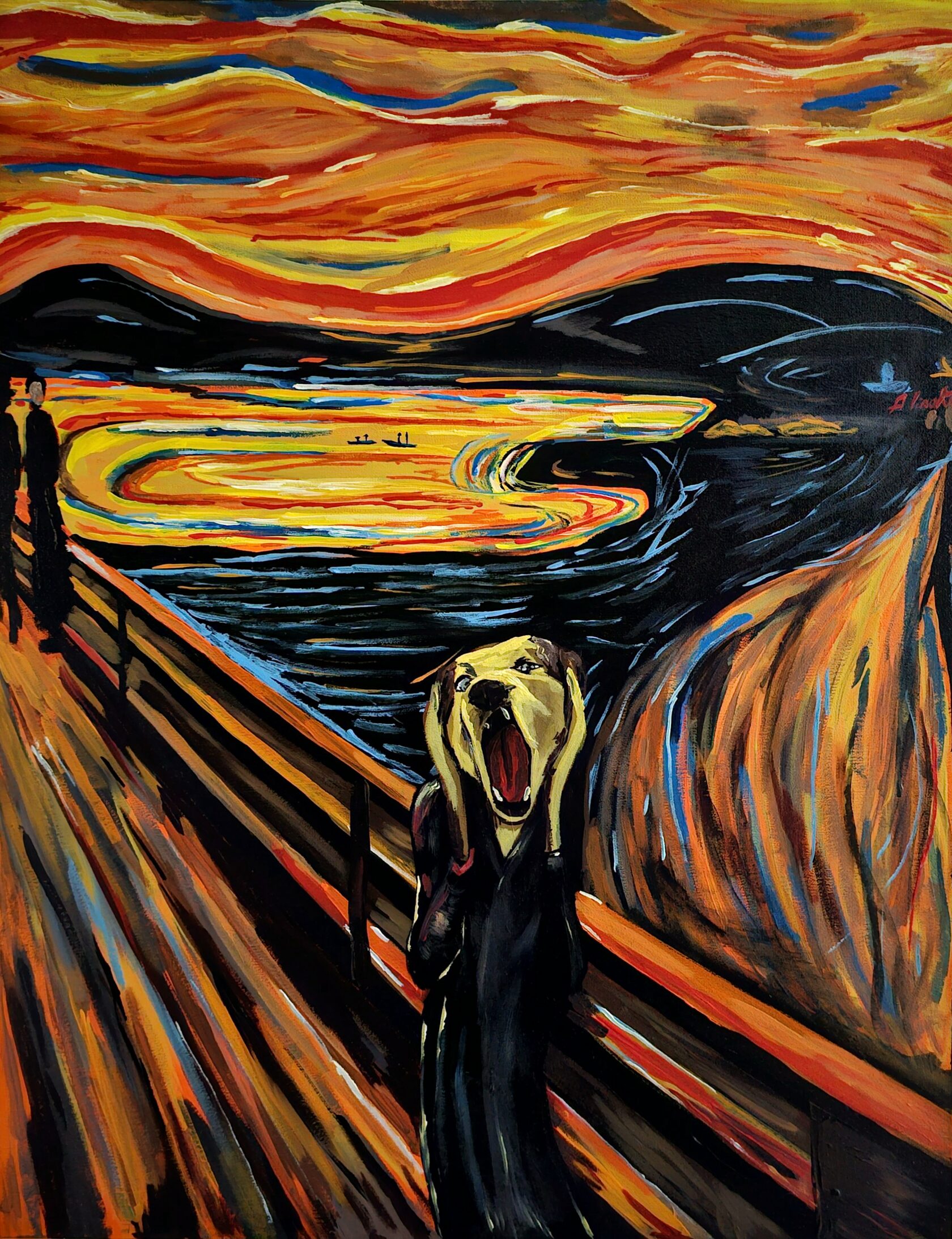 Year of creation: 2024. Varnished. Acrylics on linen canvas. Size 60 cm × 80 cm. Signed with acrylics backward and upward. The painting depicts a dog's face expressing a scream of horror, which is a parody of the famous image from Edvard Munch's "The Scream." The deep meaning and main idea of the work lie in transferring human emotions and feelings to the animal world, as well as commenting on the universality of the experience of fear and anxiety. The subtext of the painting touches on the theme of emotional intensity and the inner world of animals. The image of a dog screaming in horror serves as a metaphor for reflecting the same feelings and emotions that we humans experience in stressful and dangerous situations. The parody of Munch's famous painting aims to evoke irony in the viewer and provoke thoughts about the boundary between the human and animal worlds, as well as how we interpret and transfer our feelings to the world around us. The use of a dog's face instead of a human face adds an element of playfulness and unpredictability while still maintaining the main plot and idea of the scream of horror.