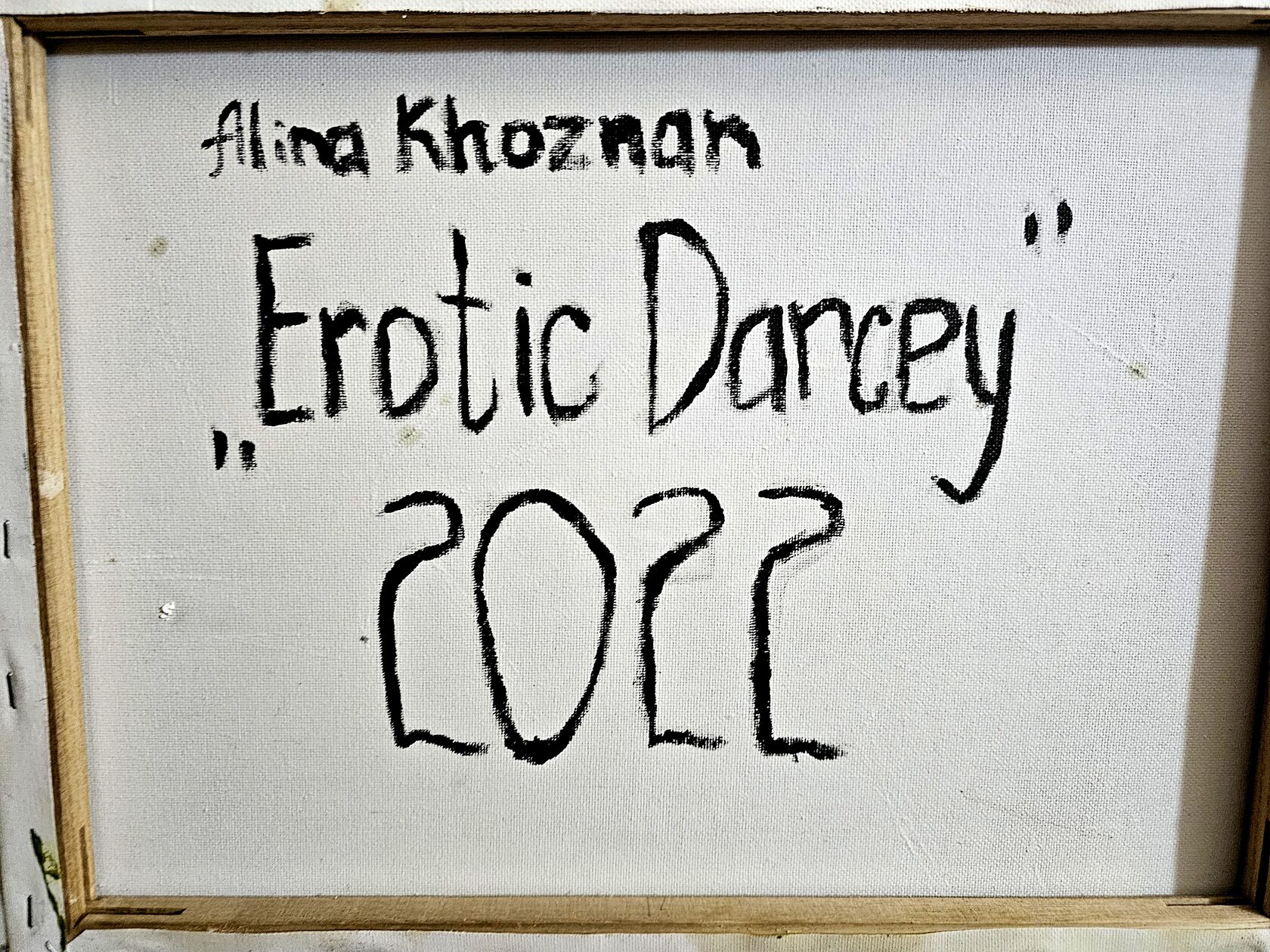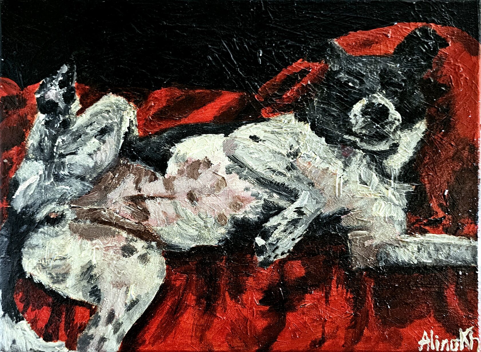 Year of creation: 2022. Varnished. Acrylics on cotton canvas. Size 30 cm x 40 cm. Signed with acrylics upward and backward. The painting "Erotic Darcey" depicts a black and white dog named Darcey on a red silk sheet. The dog playfully raised its leg, expecting affection or attention. Although the title of the painting may create certain expectations, it actually conveys the mundanity and simplicity of the moment. Darcy the dog, lying on a red silk sheet, symbolizes coziness and home comfort. The raised leg reflects her playful nature and desire to interact with others. The black and white palette of the dog against the background of the red silk sheet creates a contrasting and effective image that attracts the viewer's attention. The black background symbolizes mystery and creates a contrast with the bright red silk fabric. The overall image of the painting gives a feeling of calm and comfort, forcing the viewer to focus on the simple joys of life.