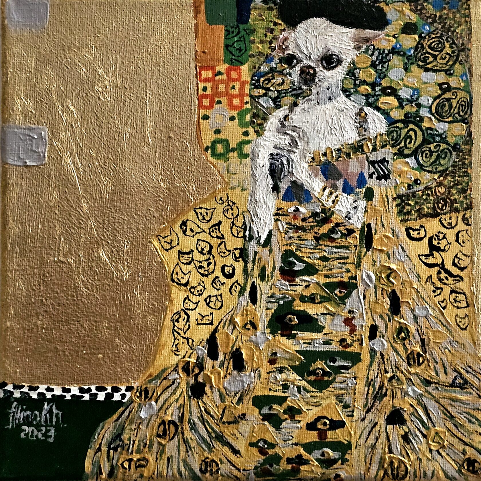 Year of creation: 2023 Varnished. Oil on cotton canvas. Size 20 cm x 20 cm. Signed with oil upward and with acrylics backward. In a parody of the painting "Golden Adele", the main character is replaced by a Chihuahua named Businka, who is depicted in tones of gold and luxury. She occupies a central place in the picture, like the original heroine, and her look is filled with expressiveness and grandeur. A parody of "Golden Adele" with a chihuahua as the main character symbolizes an ironic attitude towards the concept of luxury and sophistication. Instead of the usual image of an aristocratic beauty, we see a small dog, which creates contrast and makes the viewer smile. It is a commentary on art and culture, emphasizing that beauty and greatness can be found not only in external splendor, but also in unexpected and unusual forms. The implication of the parody is the idea that true beauty and greatness do not depend on social status or external attributes, but are found within each of us. The artist plays with the idea that true greatness can be found in small things and unexpected places. In addition, the parody offers a new perspective on traditional images in art and emphasizes that beauty can manifest itself in different forms and manifestations. The choice of a dog as the main character in the parody of “The Golden Adele” is not accidental. This choice has several connotations and symbolic meanings. Firstly, a dog, especially a Chihuahua, is often associated with luxury and sophistication, which enhances the irony and contrast with the original image of an aristocratic lady. Secondly, dogs are often seen as symbols of loyalty and devotion, which adds a new dimension to the interpretation of the painting and its meaning. So the choice of dog in this context plays on many levels, adding depth and interest to the parody.