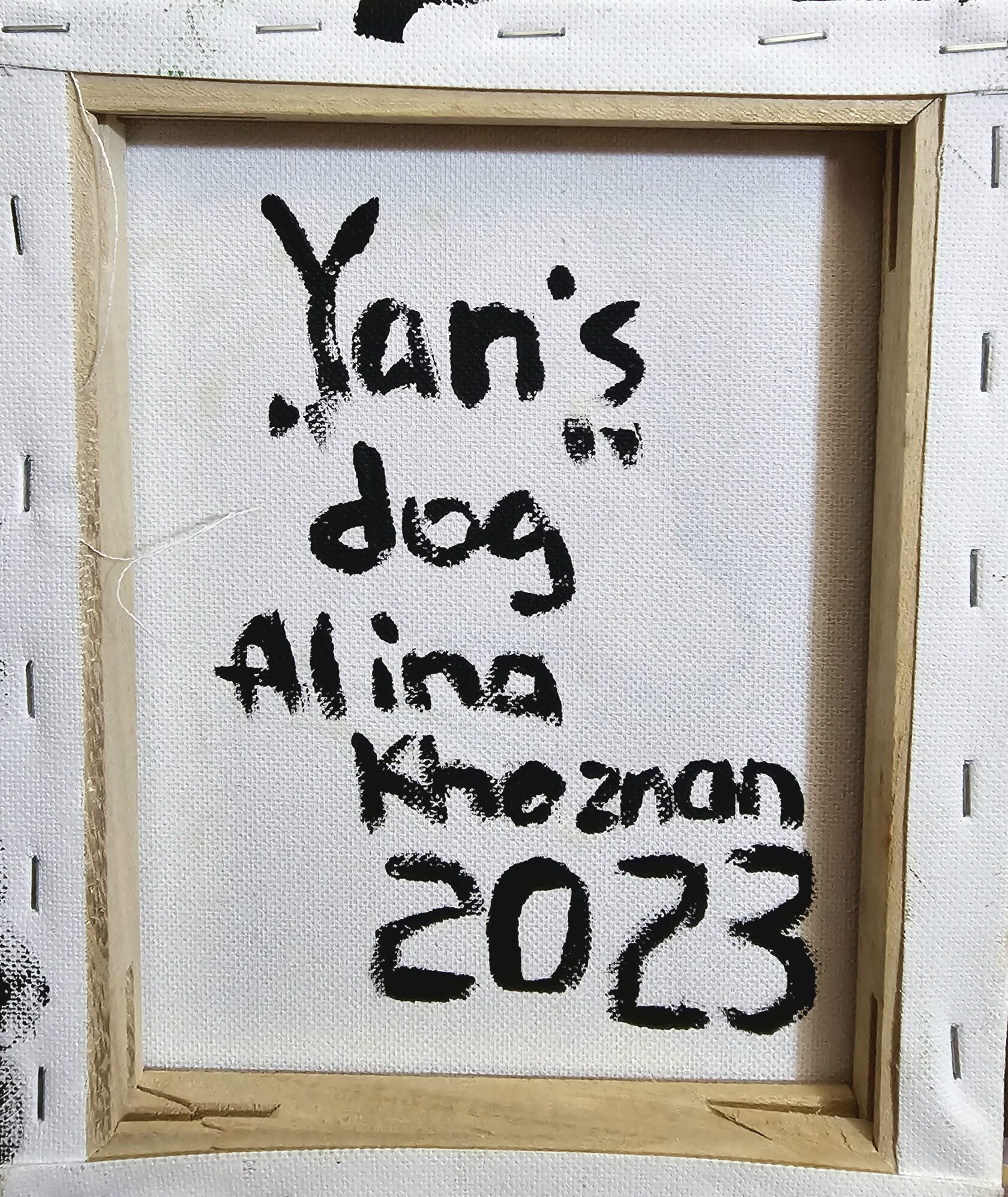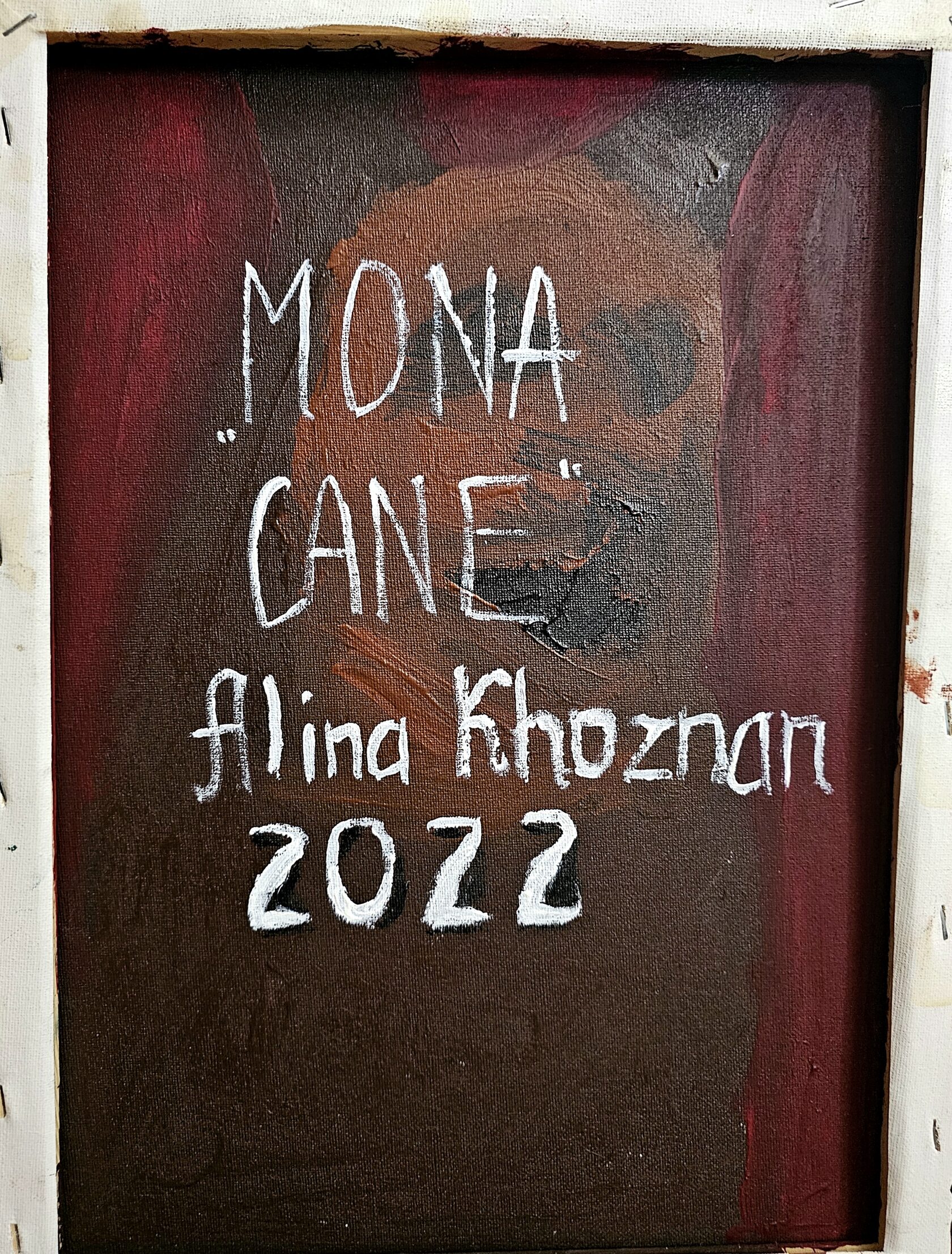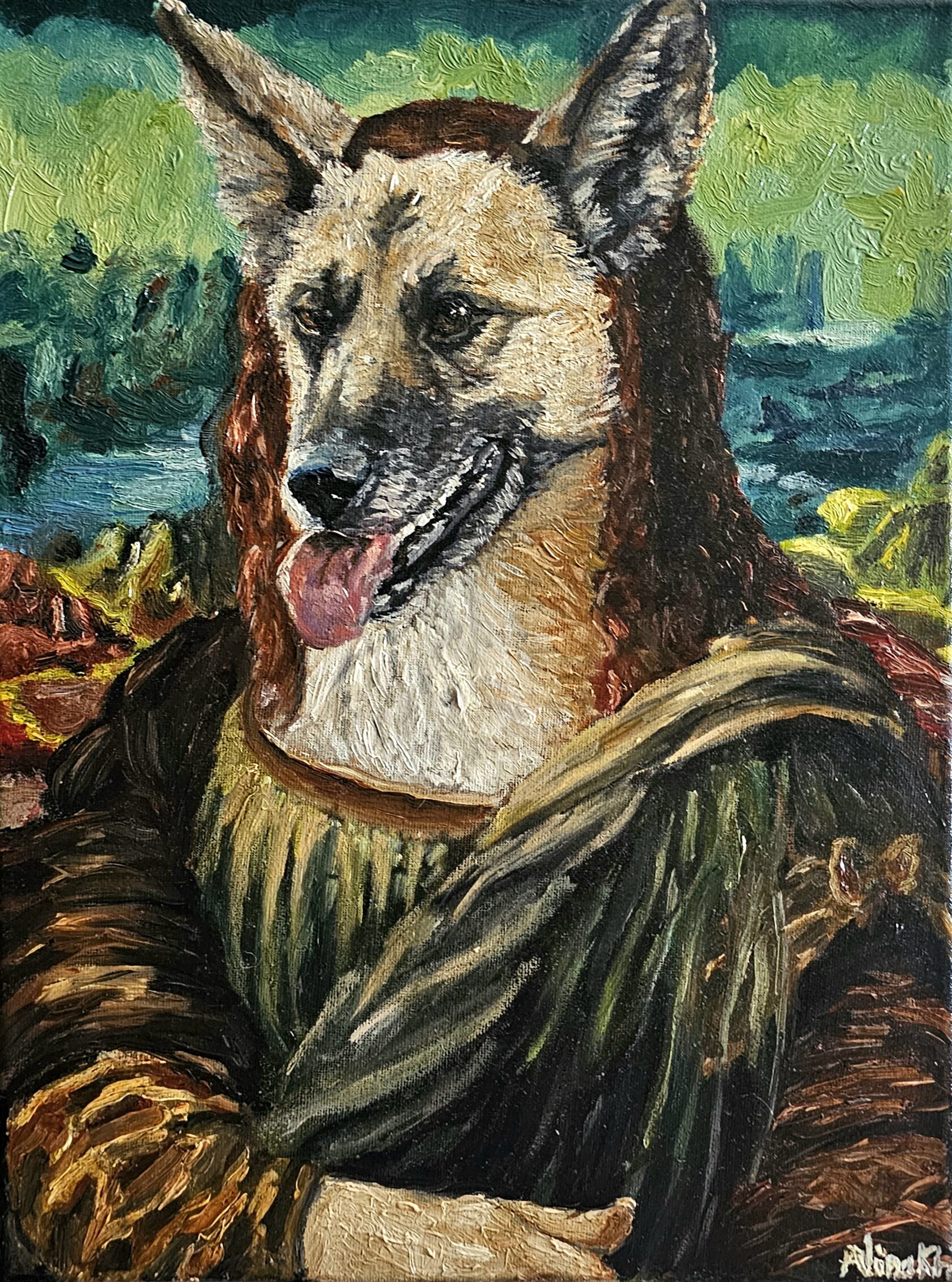 Year of creation: 2022 Varnished. Oil, acrylics and watercolor on cotton canvas. Size 30 cm x 40 cm. Signed with oil upward and with acrylics backward. The painting is a parody of the famous portrait of Leonardo da Vinci "Mona Lisa" (La Gioconda), however, instead of an image of a woman, it depicts a dog.