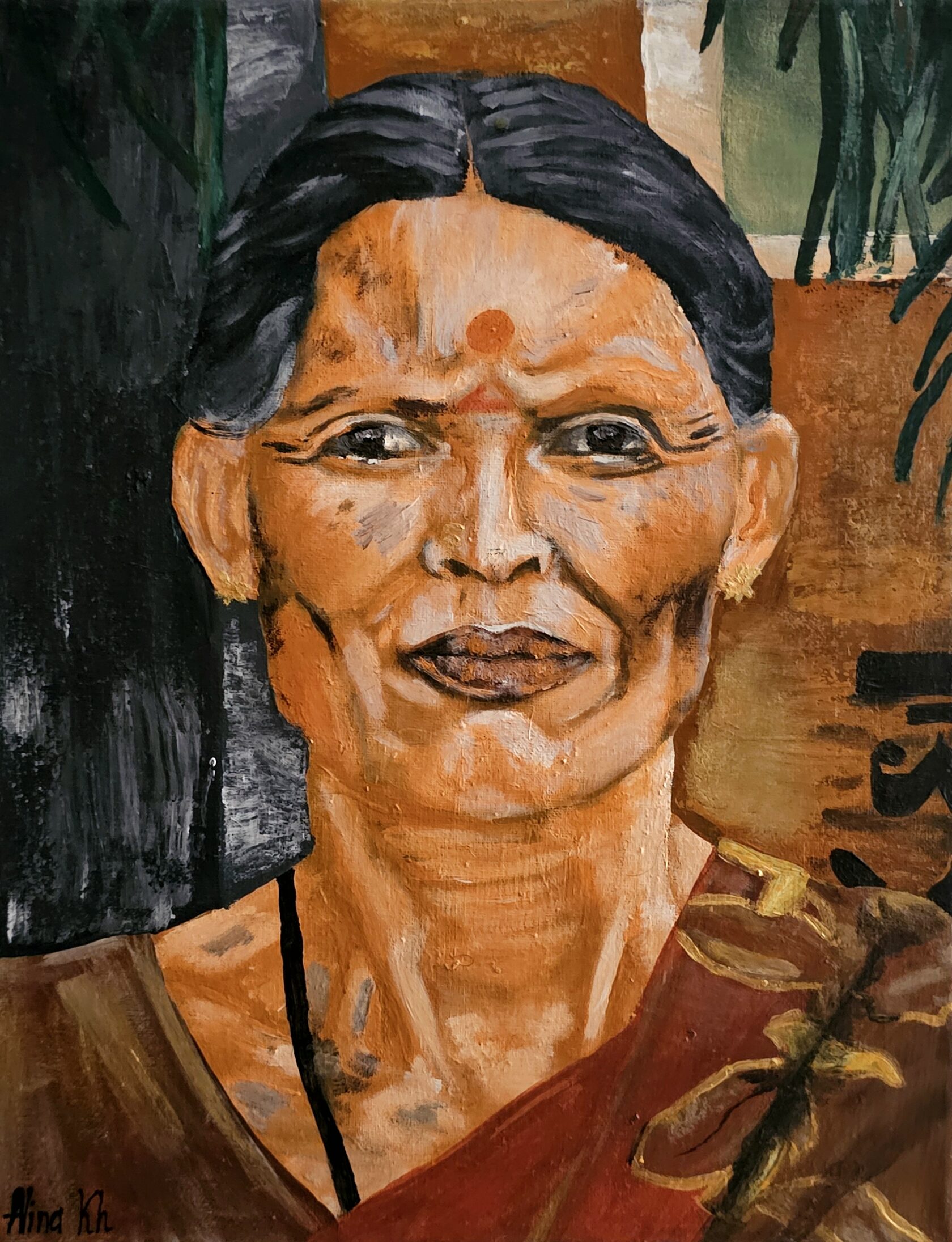 Year of creation: 2021. Varnished. Acrylics on cotton canvas. Size 35 cm x 45 cm. Signed with acrylics upward and backward. The painting “India” depicts an adult oriental woman, whose eyes attract the viewer’s attention with their depth and wisdom. Her face expresses calm and confidence, and also reflects a wealth of life experience. This painting embodies the idea of wisdom and inner wealth that comes with age and experience. A woman’s eyes become a symbol of her inner world and wisdom, reflecting the deep knowledge and experience accumulated over a long life. The color scheme and composition of the painting emphasize the atmosphere of peace and harmony, which gives the work a special aesthetic appeal. "India" encourages the viewer to reflect on the value of life experience and the wisdom that comes with age. The picture reminds us of the importance of respect for elders and appreciation of their knowledge and experience. She also inspires you to realize the beauty of growing older and to accept your inner path to wisdom and peace.