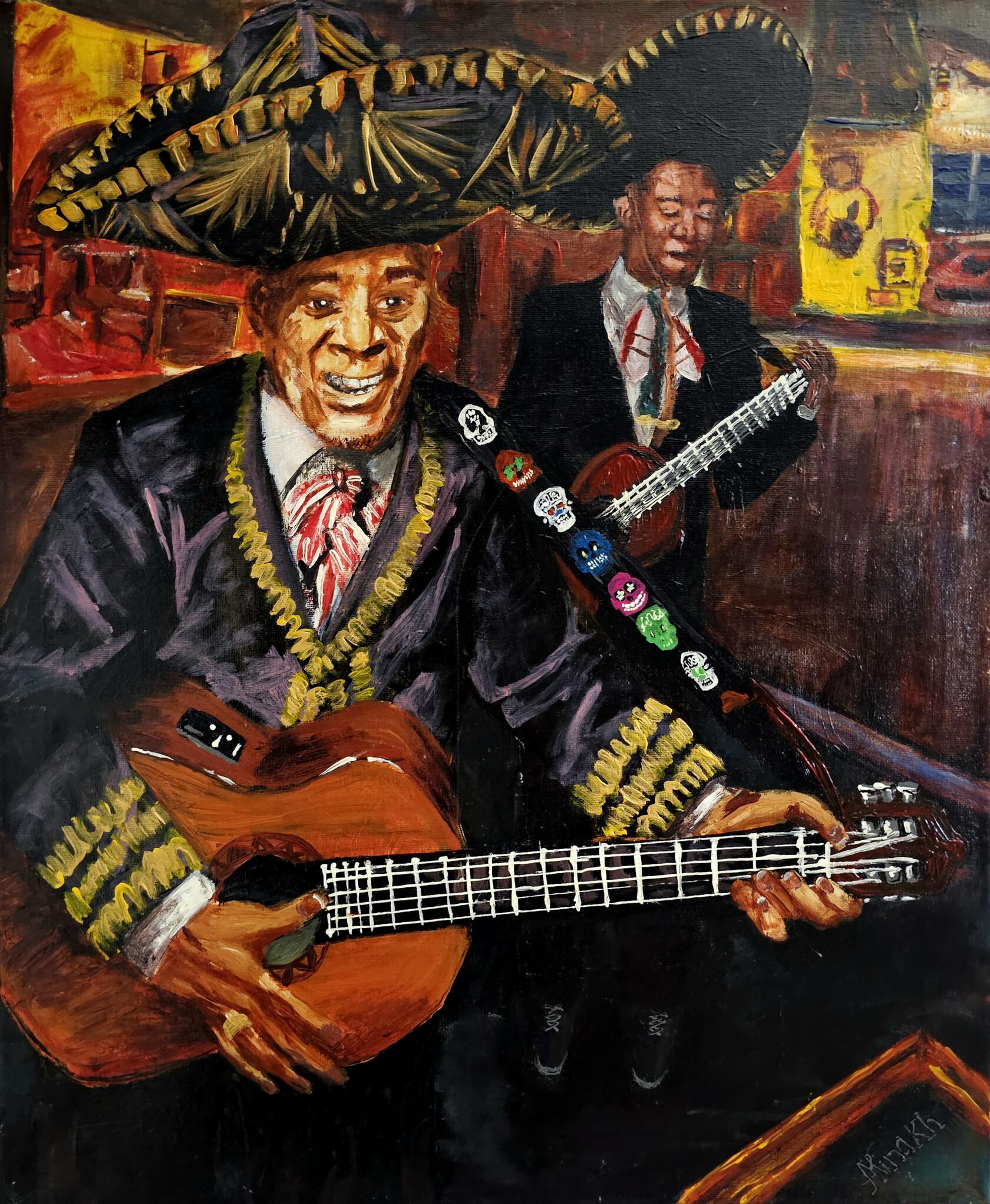 Year of creation: 2021 Varnished. Acrylics on cotton canvas. Signed with acrylics upward and backward. Size 50 cm × 60 cm. In the painting "Rhythms of Mexico," a moment of absolute delight and happiness is captured. Two guitarists enthusiastically play in a local restaurant, fully absorbed in the music and the act of performing. This painting conveys the emotional intensity of a moment when a person is entirely immersed in their creativity and experiences the utmost satisfaction from the process. The deep love for music and dedication to their art are reflected in the guitarists' eyes and facial expressions. The color palette, rich with warm tones and shades of red, emphasizes the passion and vibrancy of the scene, as well as the atmosphere of Mexico, where a love for music and dance is an integral part of the culture. "Rhythms of Mexico" invites the viewer to feel the moment of joy and total immersion in the creative process. This painting serves as a reminder of the importance of dedication and passion for one's craft in achieving true fulfillment and success.