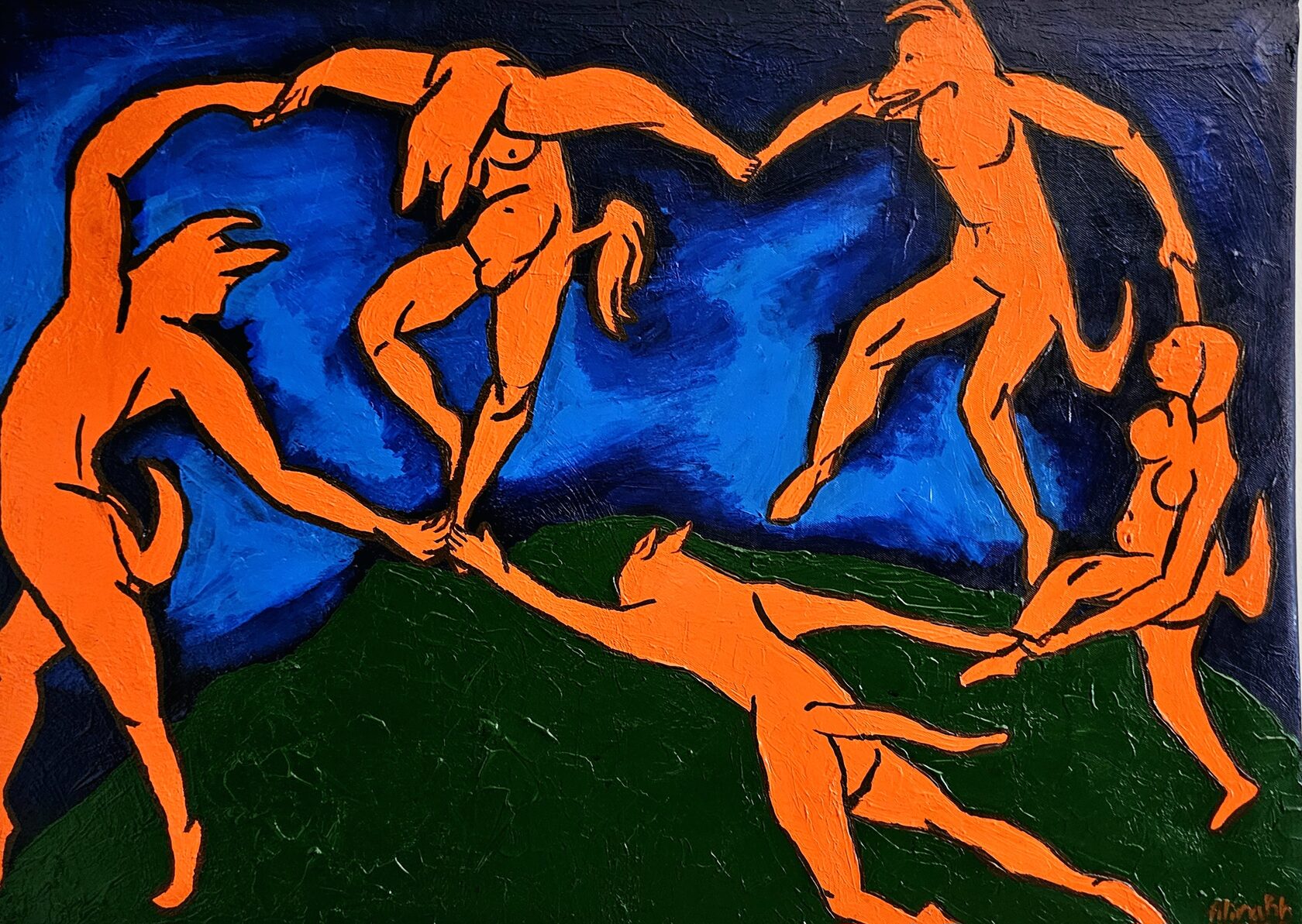 Year of creation: 2023 Varnished. Acrylics on cotton canvas. Signed with acrylics upward and backward. Size 70 cm × 50 cm. The paintings depict dogs posed in positions characteristic of the dancing figures in Matisse's original painting "The Dance." The dogs occupy the central space of the composition, surrounded by abstract shapes and figures. A vivid and vibrant palette, consisting of orange, deep blue, green, and brown, is used to highlight the energy and dynamism of the work, as well as to convey bright emotions and impressions. Orange and deep blue symbolize passion and emotional intensity. Green represents vitality and energy, while brown signifies earthly stability and a connection to nature. This parody of Matisse's "The Dance" with dogs invites the viewer to reflect on the nature of dance, communication, and interaction. Replacing the human figures with dogs is the artist's attempt to explore the idea that communication and interaction are not limited to humans and can occur in various forms and manifestations. The deeper meaning of the work also lies in an ironic commentary on how animals can contribute to cultural and artistic processes, as well as how we can reconsider familiar images and ideas through the lens of the animal world.