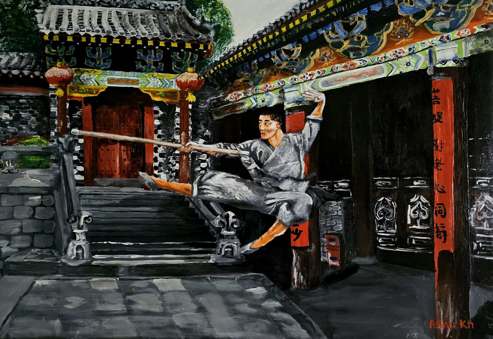 Year of creation: 2021 Varniahed. Acrylics on cotton canvas. Size 50 cm x 70 cm. Signed with acrylics upward and backward. The painting "Shaolin Monc" reflects the idea of spiritual practice and achieving inner peace through training the mind and body. A monk floating in the air with a stick symbolizes the highest level of mastery and spiritual enlightenment achieved through hard training and inner work. The temple in the background complements this idea, indicating a connection to a spiritual tradition and a place of practice. Regarding the choice of palette, the use of bright colors in this painting is a way of conveying the characteristics of Chinese culture and the energy of Shaolin monasticism. The bright colors reflect the dynamism and energy of the Shaolin exercises and are also associated with cultural elements of China, such as colorful traditional costumes or jewelry. Overall, Shaolin Monc is not only a visually appealing work, but explores deep themes of spiritual practice, craftsmanship, and cultural heritage.
