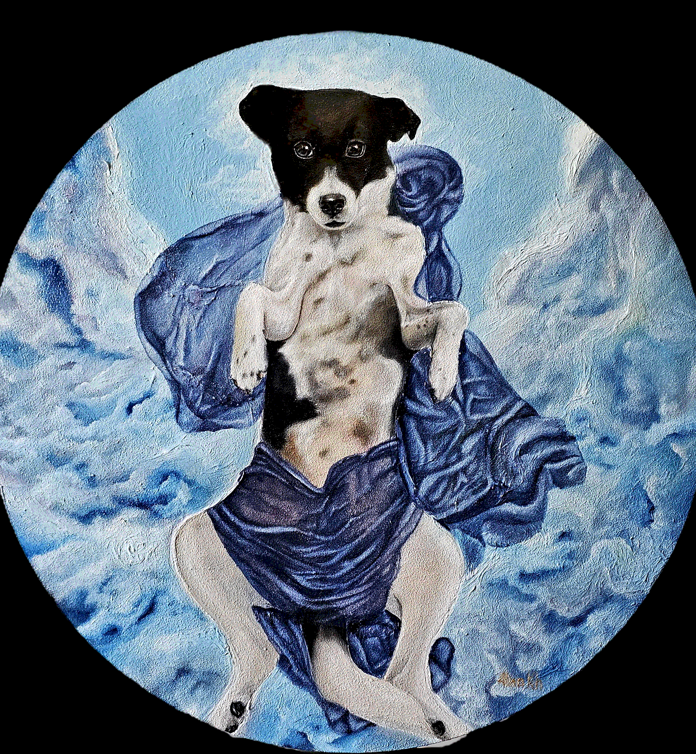 In this painting, I depict Darcey - my muse, my dog, my little world. When I painted her, I imagined Darcey not just as a pet, but as a celestial being soaring among the clouds, like the goddess Aphrodite, wrapped in a light silk veil. In this weightlessness, she reigns - free, proud, and magnificent.