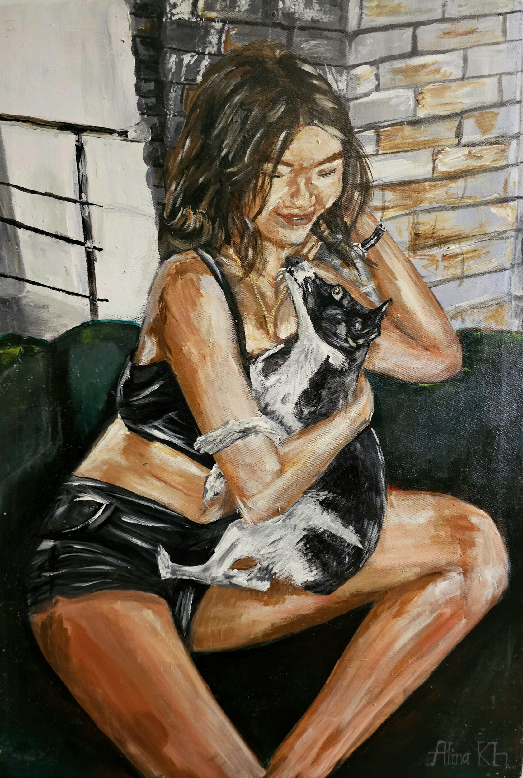 Year of creation: 2021 Varnished. Acrylics on cotton canvas. Size 50 cm x 70 cm. Signed with acrylics upward and backward. A unique work of art, a self-portrait is presented. In this picture, the author, the owner of golden hands, depicts himself and his faithful companion - a dog named Darcy. The looks of both are filled with mutual tenderness and devotion. The power of a genuine connection between a person and their pet permeates every moment of this masterpiece. "Me and Darcy" is not just a self-portrait, it is a story about mutual love and trust. The artist captured a moment of sincere tenderness that penetrates the heart of everyone who finds themselves in front of this picture. The gray brick wall and window in the background emphasize the homeliness and warmth, creating an environment in which real relationships bloom. The self-portrait “Me and Darcy” embodies the ideal of ideal friendship and fidelity. This image reminds us of the importance of a pet's presence in a person's life and how it can fill our days with joy and tenderness. This painting is not just a decoration for your home, it is a true work of art that will remind you of the importance of love and fidelity in your life.