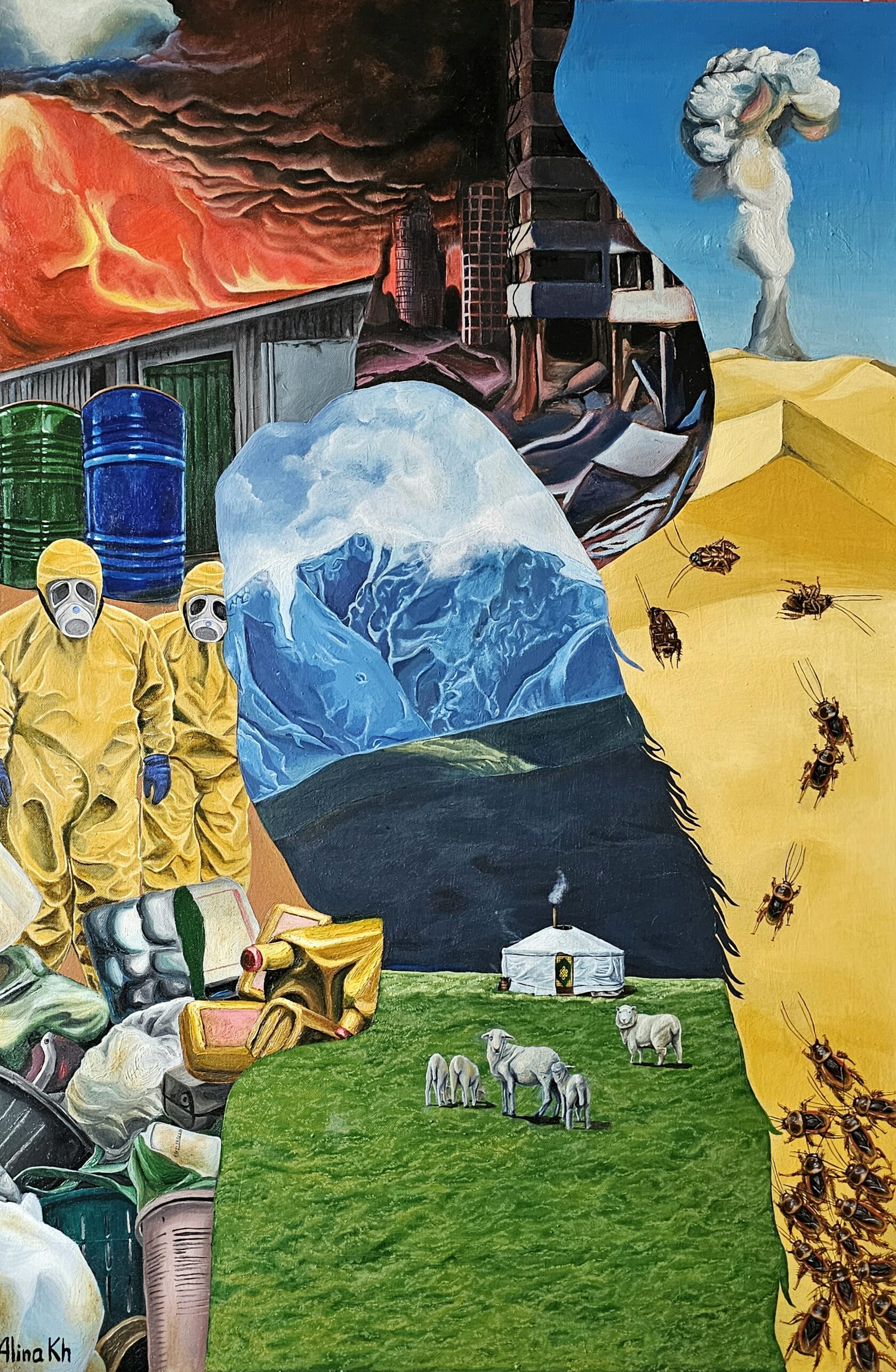 Amid this tension between hope and devastation, a yurt appears — a symbol of Kazakh heritage, simplicity, and harmony with the land. It represents the past, when life was lived closer to nature, but also serves as a warning: if we abandon preservation, the past may be all that remains, while the future becomes unlivable.