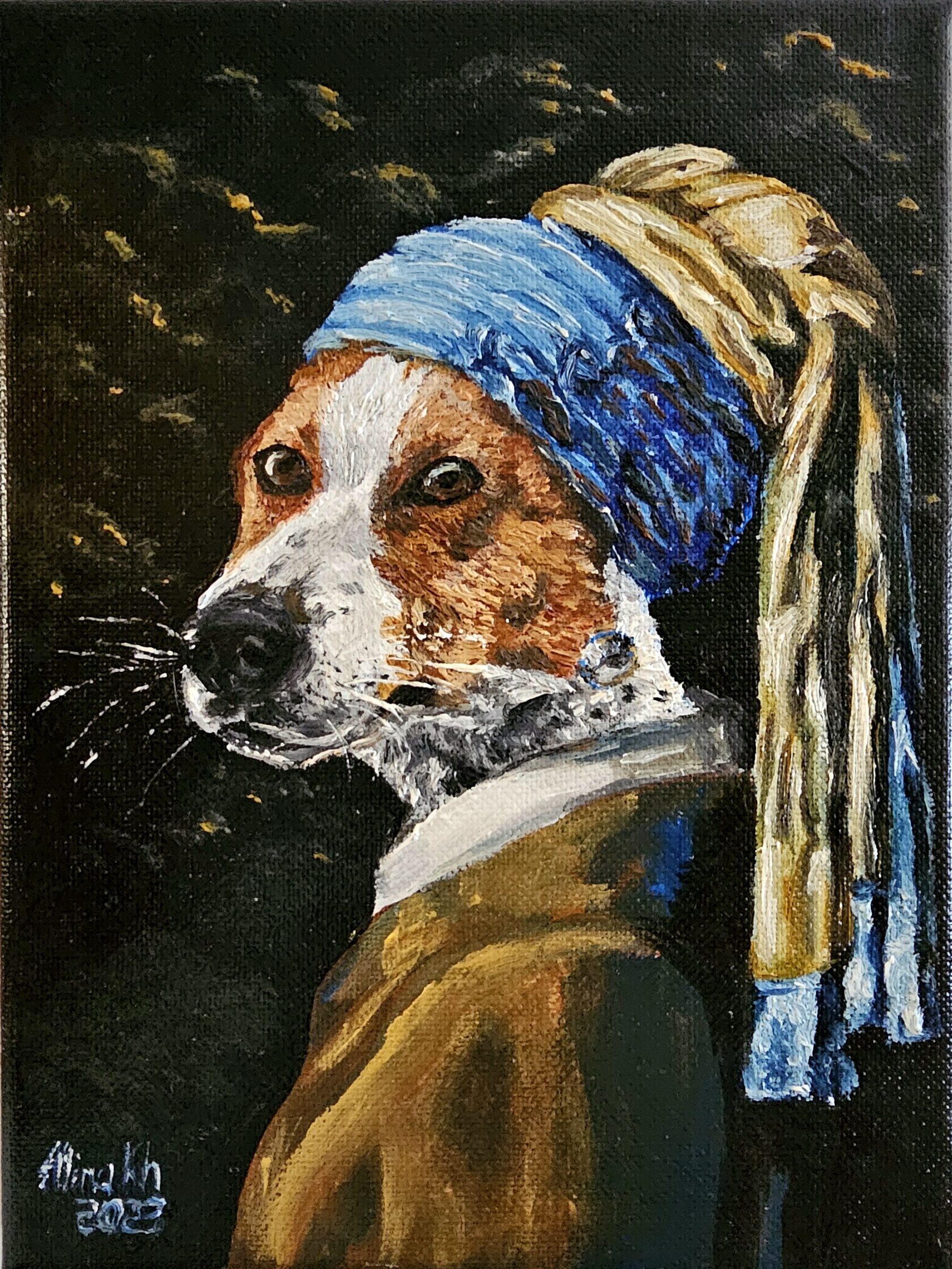 Year of creation: 2023 Varnished. Oil on cotton canvas. Size 18 cm x 24 cm. Signed with oil upward and with acrylics backward. The painting is a parody of the famous portrait of Jan van Eyck "Girl with a Pearl Earring". However, instead of a picture of a girl, it shows a dog of no specific breed.