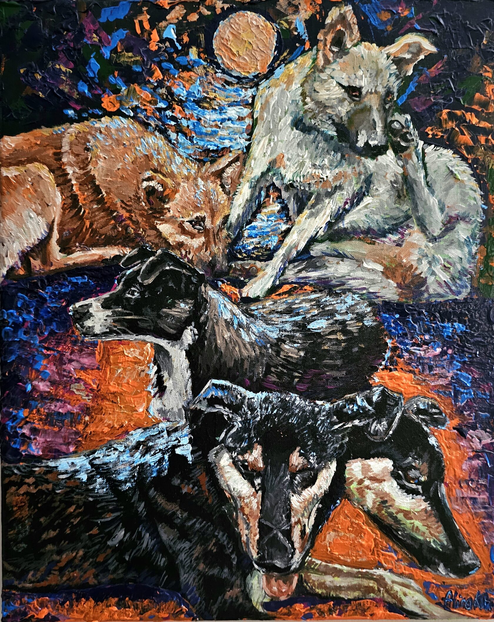 Year of creation: 2023 Varnished. Acrylics on cotton canvas. Size 40 cm x 50 cm. Signed with acrylics upward and backward. The painting "Vengo Dalla Luna" unfolds a lively scene full of intrigue and tension. The focus is on a pack of dogs, enthusiastically going about their business under the moonlight. Each dog has its own unique role and personality, creating the impression of a dynamic hierarchy within the group. The name "Vengo Dalla Luna" alludes to the dogs' mystical origins, embodying their connection with the mysterious and unusual. A pack of dogs is a society with its complex relationships and hierarchy. Despite its small size, the dog in the center has a dominant position, which emphasizes its strong character and leadership qualities. The remaining dogs in the pack, focused on their own business, serve as unique elements in this dynamic picture, creating a sense of internal tension and movement. "Vengo Dalla Luna" invites the viewer to look into the mysterious world of dogs and their inner lives, revealing unexpected qualities and relationships in them. The use of a bright and lively palette emphasizes the emotionality and dynamism of the scene, immersing the viewer in the atmosphere of mystery and magic of a moonlit night. This picture calls for paying attention to complex relationships in society and exploring the inner world of man through the prism of nature.