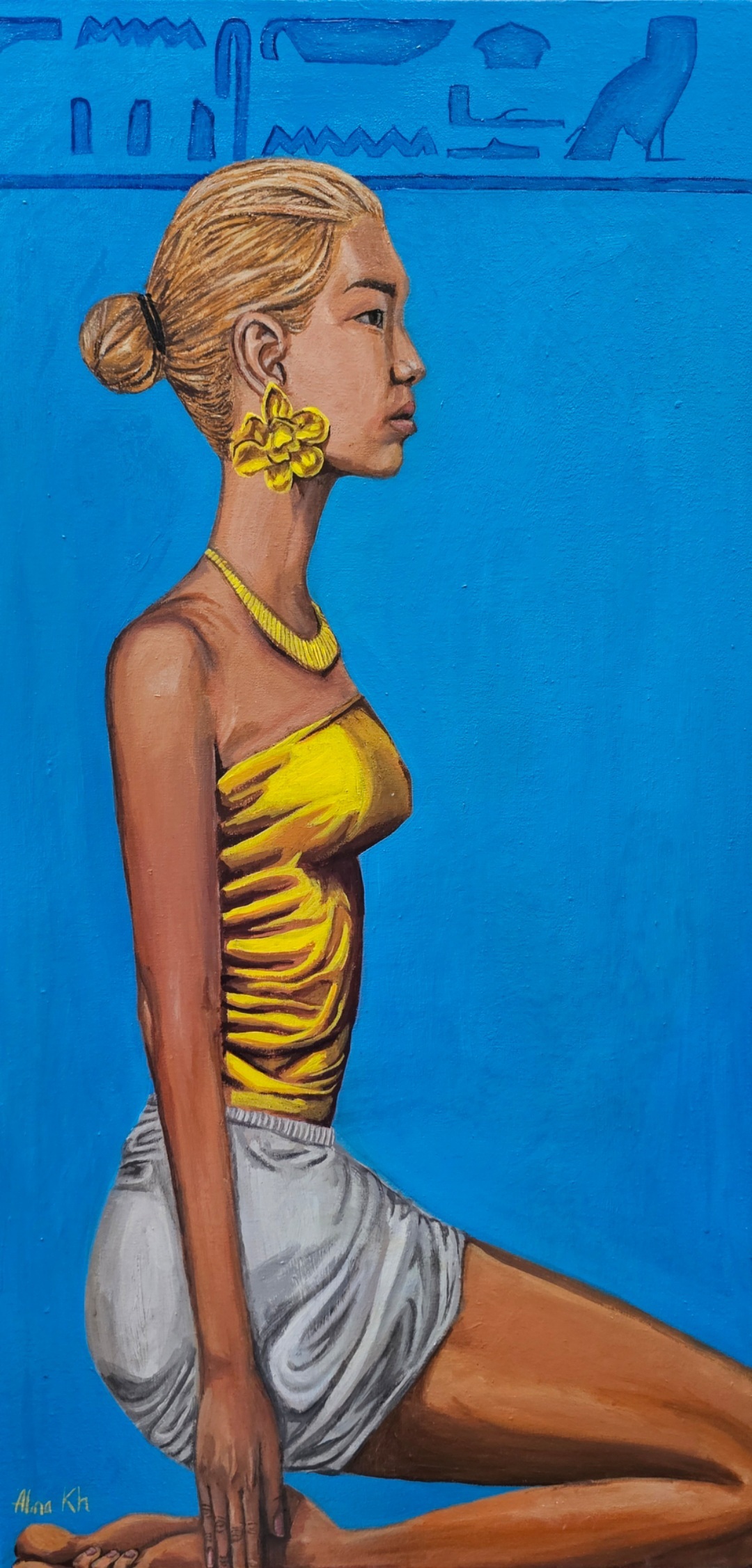 Year of creation: 2024 Varnished. Acrylic, watercolor, polyurethane rubber on canvas. Size 60cm x 80cm. Signed with acrylic upwards and backwards. This painting portrays a close-up self-portrait, blending traditional and modern elements. Silver eyeshadow, gemstones on my face, wet hair, and traditional Kazakh earrings symbolize my connection to my homeland. The background features a Kazakh tekemet (carpet) in light yellow with blue ornaments, representing my dual identity—rooted in tradition but looking toward the future.