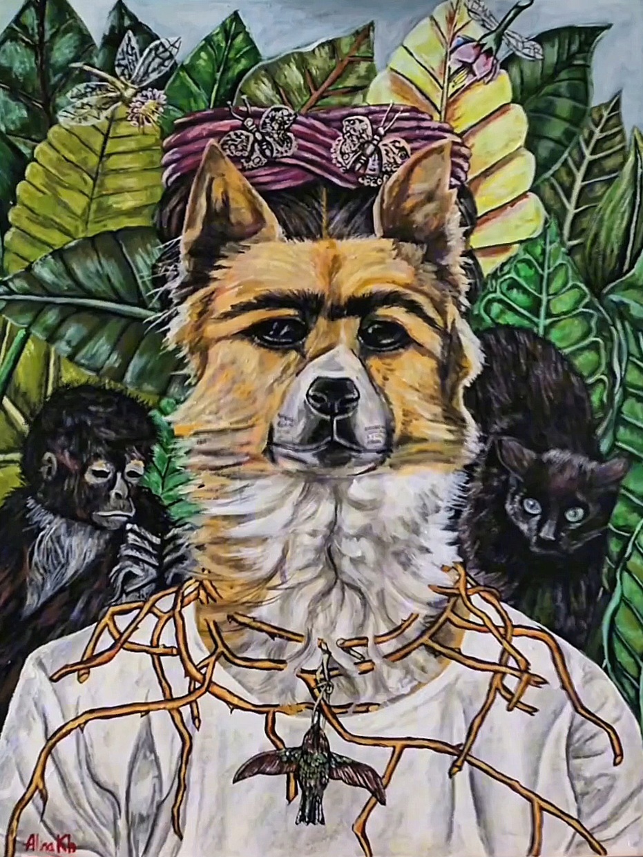 Year of creation: 2024 Varnished. Acrylics on cotton canvas. Size 40cm x 50cm. Signed with acrylics upward and backward. "Portrait with Thorn Necklace and Hummingbird" is a parody of Frida Kahlo's famous painting. Replacing Frida's face with that of a dog adds a touch of humor while preserving the painting's deeper meaning.