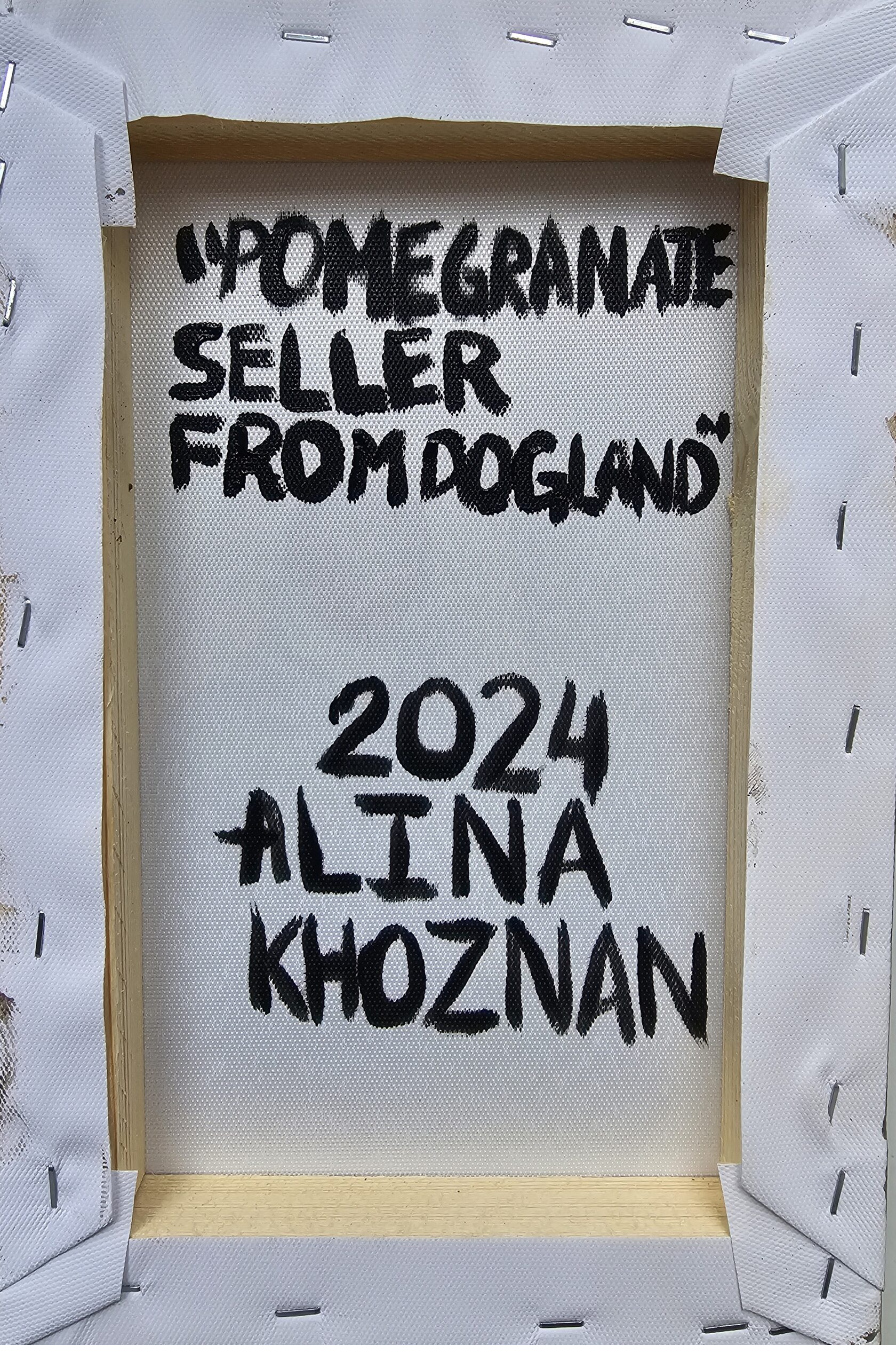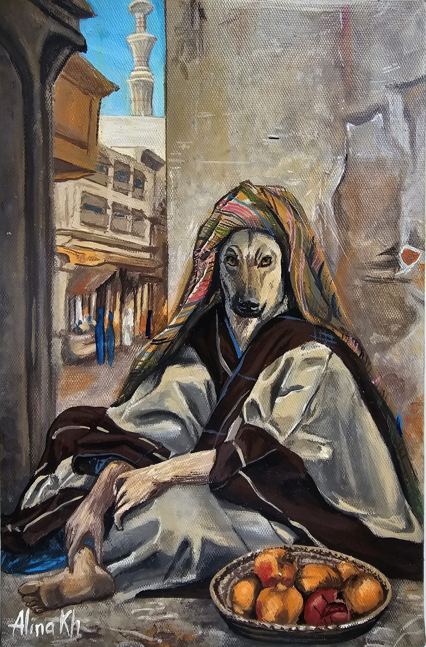 Year of creation: 2024 Varnished. Acrylics, watercolor on cotton canvas. Signed with acrylics upward and backward. Size 20cm x 30 cm. This parody of William Bouguereau's The Pomegranate Seller presents a playful twist, where the figure retains the original human body and attire but now has the face of a dog. The classic posture, with the figure holding a basket of pomegranates, remains unchanged, preserving the elegance and detail of the original composition. However, the substitution of the dog’s face introduces an unexpected element of humor and surrealism. The juxtaposition between the refined, traditional clothing and the animal's face adds a layer of whimsy, while still respecting the painting’s classical aesthetics. This artwork subtly shifts the viewer’s perception, blending the boundaries between human and animal in a way that is both charming and thought-provoking.