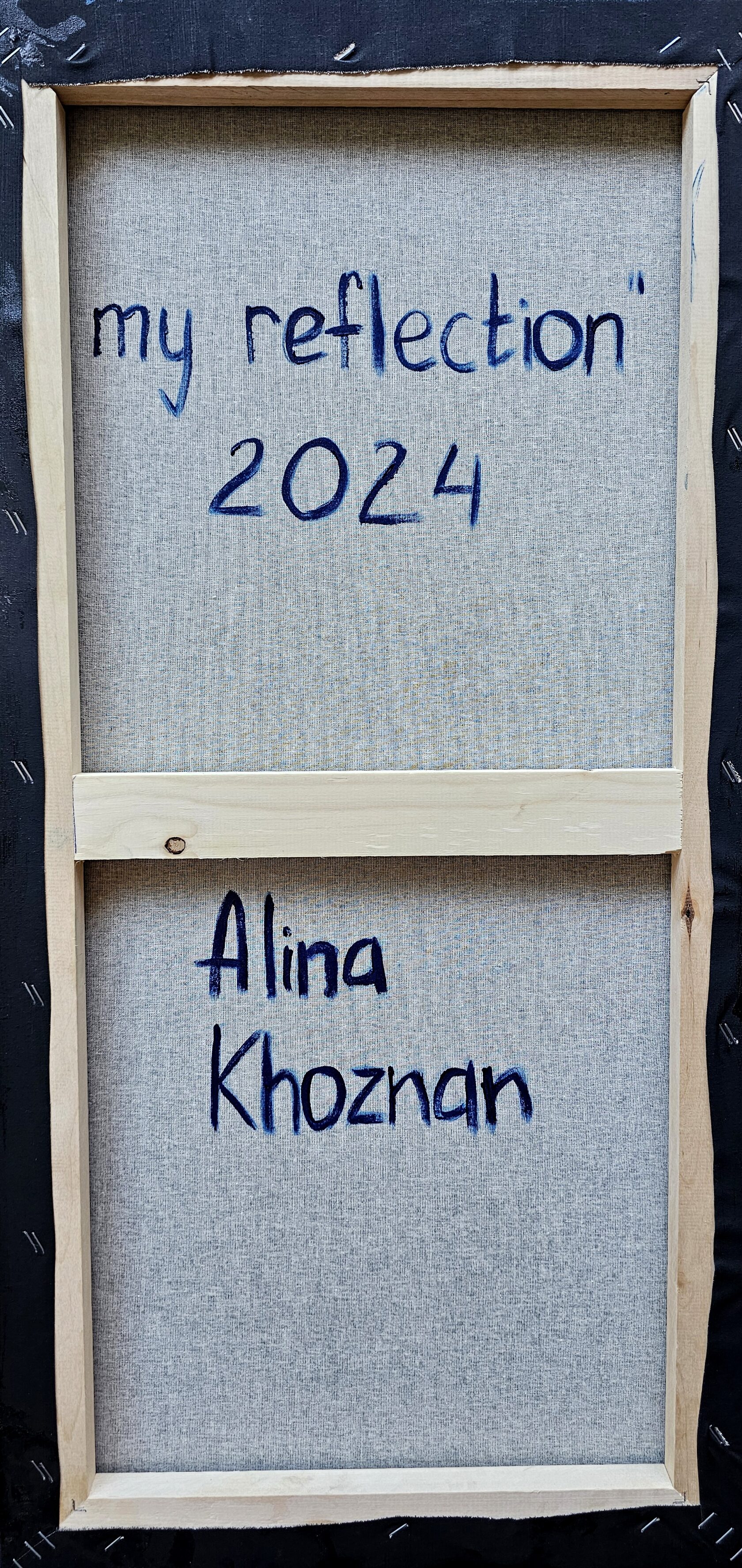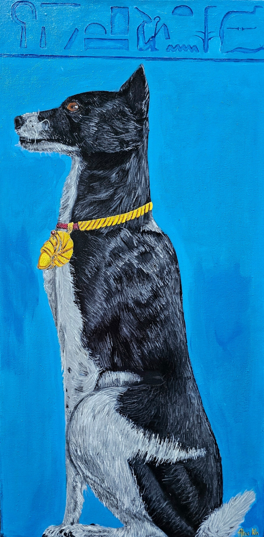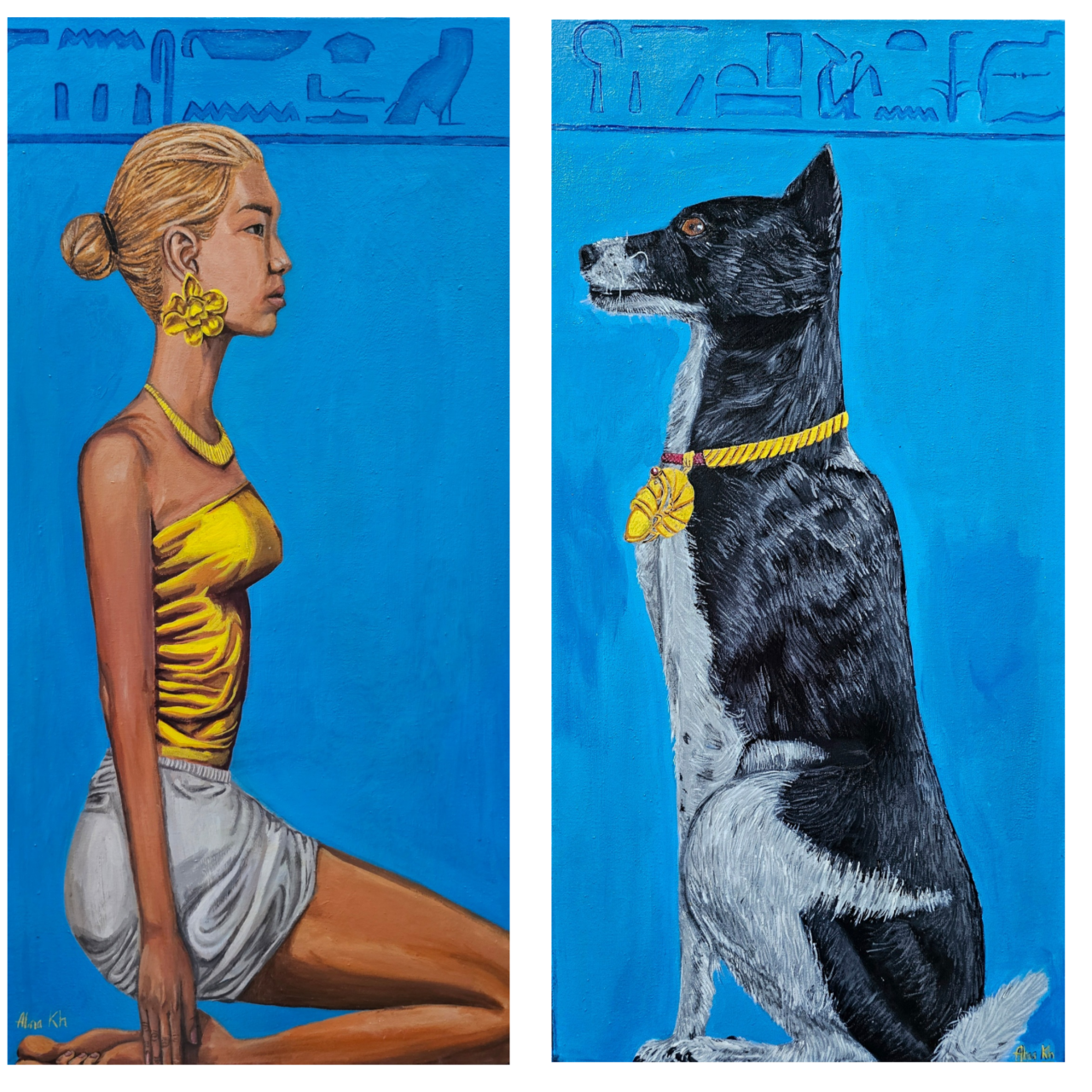Year of creation: 2024 Varnished. Acrylics, watercolor on cotton canvas. Signed with acrylics upward and backward. Size 40cm x 80 cm each. "Me and My Reflection" is the centerpiece of my exhibition Mirror of My Soul, expressing my passion for travel and my deep bond with my dog. Created in a modernized Egyptian style, the diptych highlights not only our physical resemblance but also our shared habits and personalities. Both of us wear golden jewelry, symbolizing the sacredness and richness of our connection. The first painting, Me, shows me sitting near the border of the canvas, gazing towards the second painting, My Reflection, where my dog sits in a similar pose, looking back at me. This mirroring creates a visual dialogue, emphasizing how my dog reflects aspects of my inner self. Through this reflection, the diptych explores identity and self-perception, suggesting that our closest companions can reveal hidden parts of ourselves. Ultimately, the paintings symbolize both my love for travel and the emotional journey of self-discovery through my relationship with my dog.