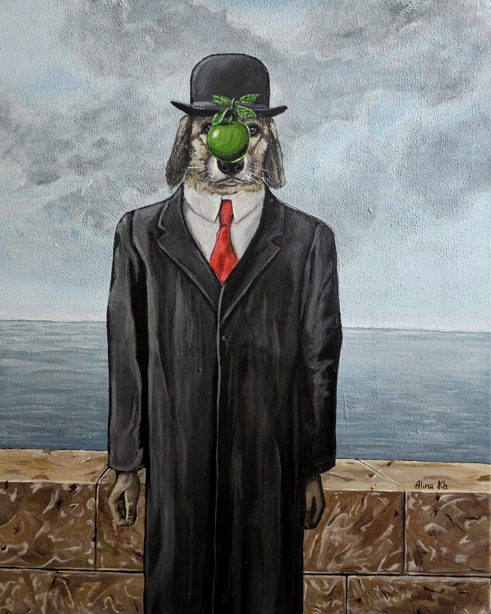 In the painting inspired by René Magritte's "The Son of Man," a dog is depicted in a classic suit and hat like in the original, but instead of a human face, there is the dog’s snout, obscured by an apple. The animal's pose and clothing are stylized to resemble a human, giving the dog an anthropomorphic appearance while retaining its natural form. This contrast emphasizes the idea of the unity of all living beings.