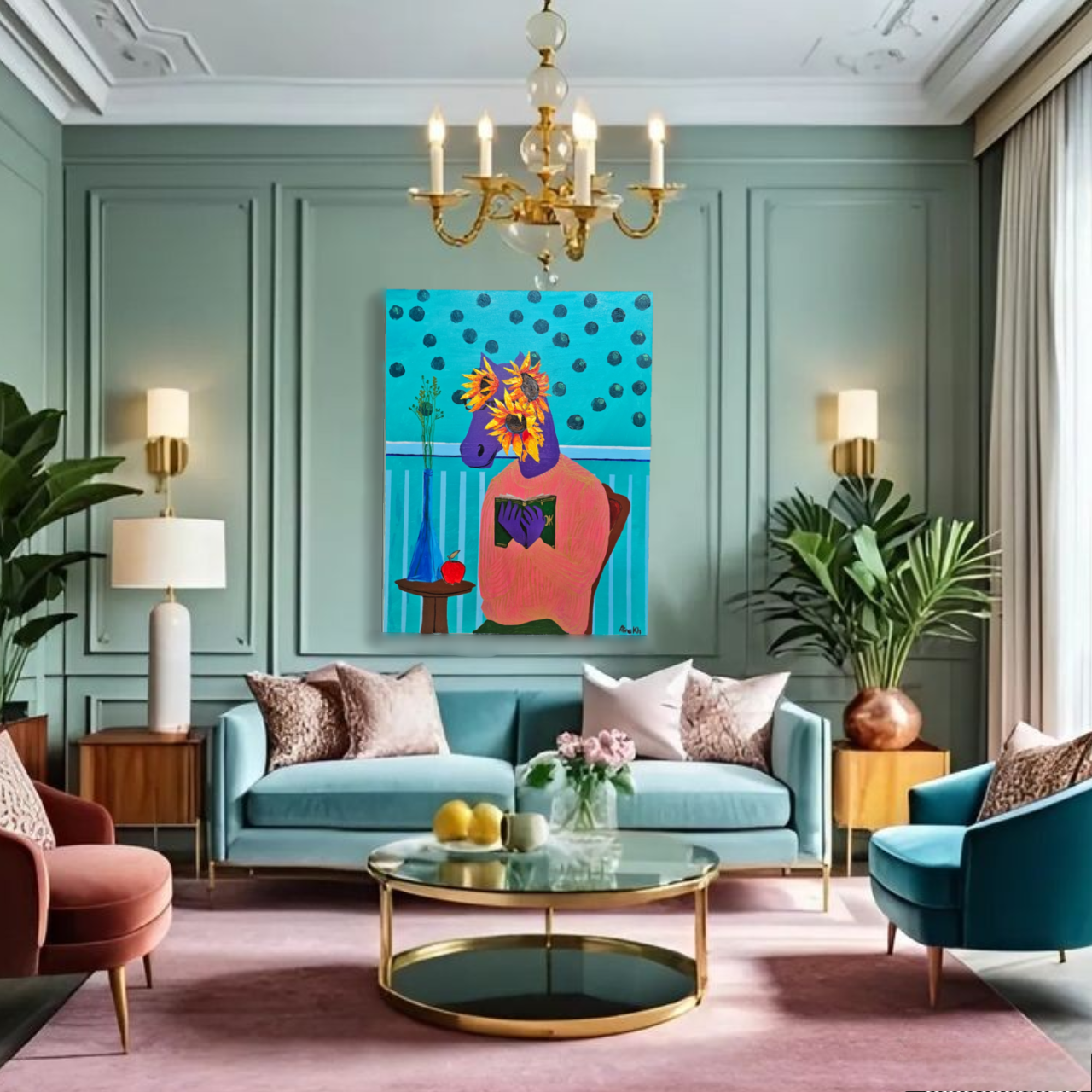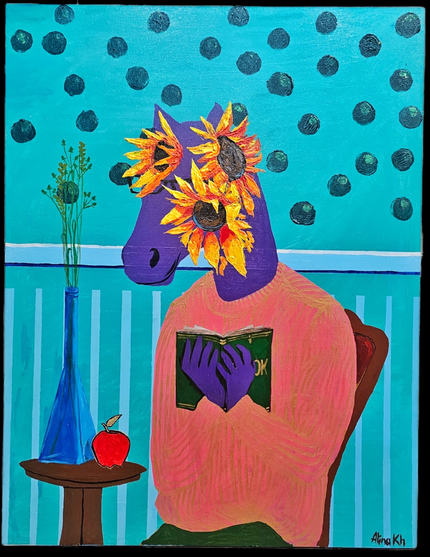 Acrylic, canvas. Size 90 cm x 70 cm. This painting is about a person depicted in the form of a horse, symbolizing their peacefulness and harmony with the world. The flowers reflect their beautiful inner world creative nature, and high emotional intelligence. The character in the painting sees only beauty and shares this love for life with others. They have a high IQ, love reading and strive to learn new things.