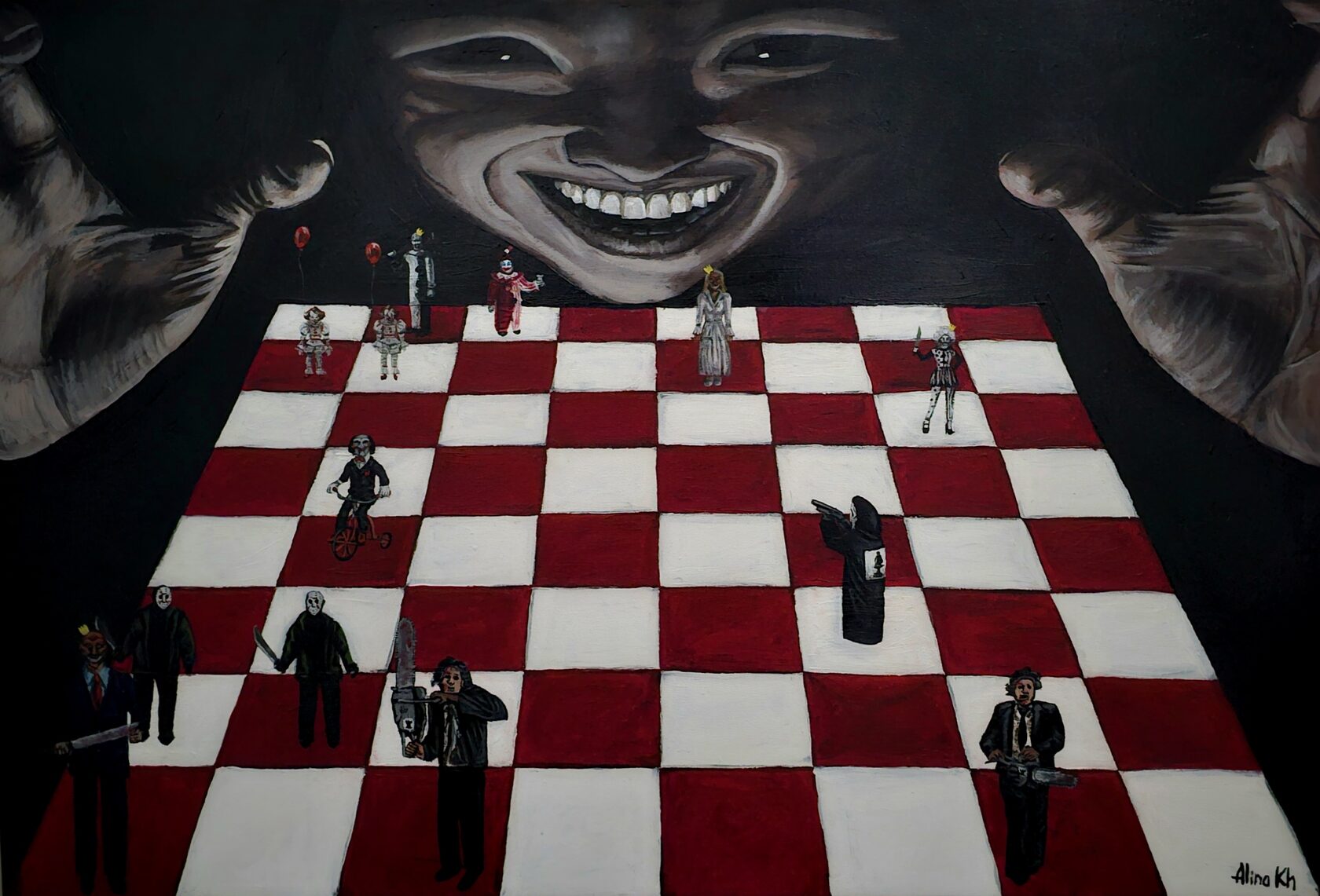 This painting reflects a profound love for both chess and horror films, showcasing how the strategic game mirrors the tension and fear inherent in the genre. "Truth or Chess" invites viewers to ponder the interplay between strategy and survival, leaving them questioning their own perceptions of fear and control.