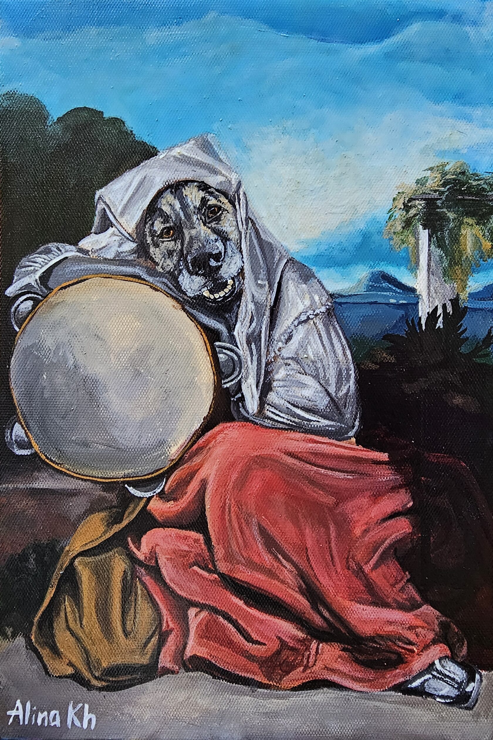 Year of creation: 2024 Varnished. Acrylics, watercolor on cotton canvas. Signed with acrylics upward and backward. Size 20cm x 30 cm. This parody of William Bouguereau’s Lady with Tambourine maintains the original’s classical elegance but adds an element of whimsy by replacing the human face with that of a dog. The figure’s body, posture, and the delicate tambourine remain untouched, preserving the graceful lines and gentle poise characteristic of Bouguereau’s work. The dog’s face, while humorous in its unexpected placement, is not exaggerated; instead, it blends seamlessly with the human form, allowing the viewer to explore the deeper contrast between human grace and animal innocence.