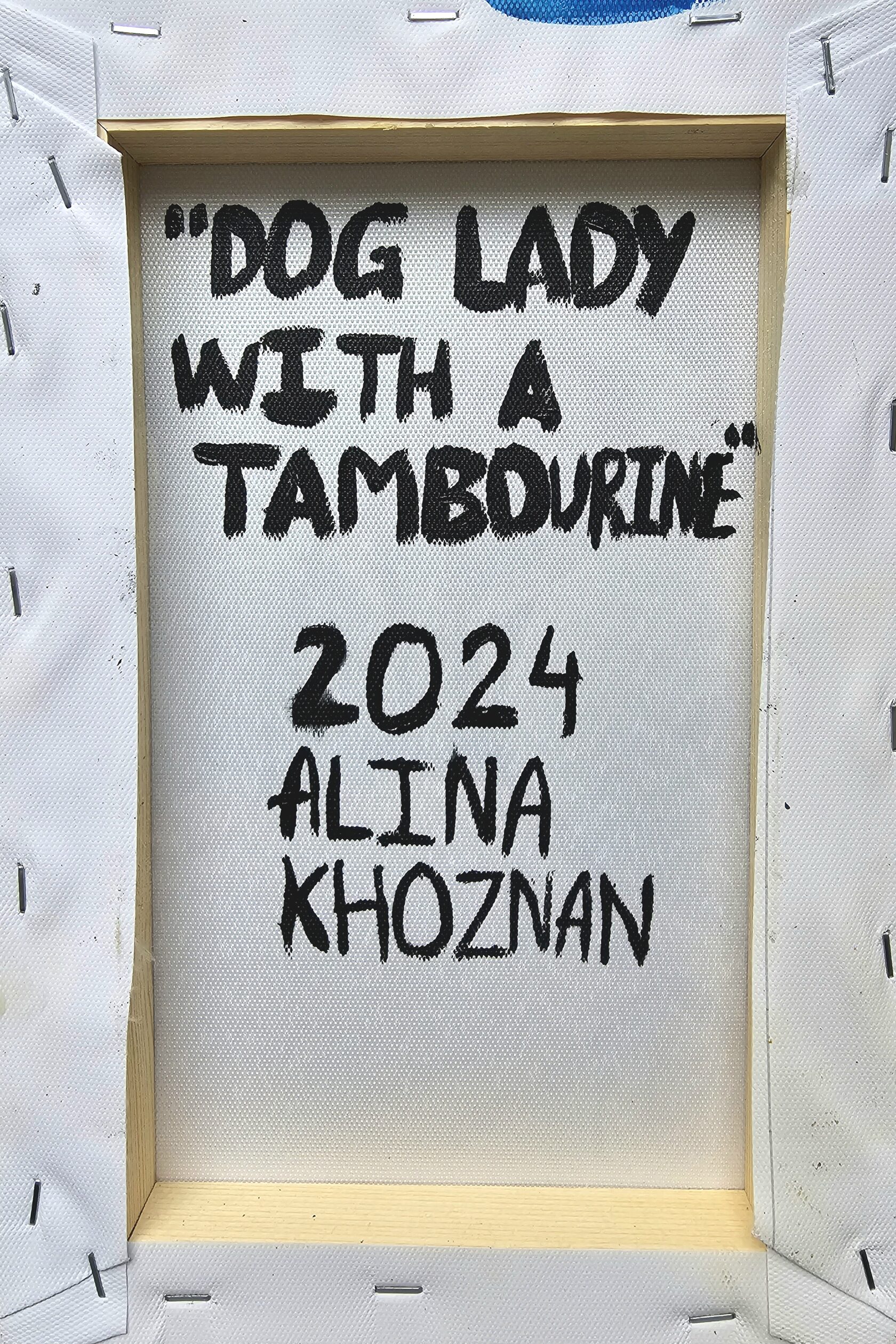 By inserting a dog's face into this traditional and romantic depiction, the painting questions the boundaries between human and animal characteristics, blending dignity with humor. It also subtly critiques the idea of idealized beauty, replacing the delicate human face with that of a dog, but without diminishing the overall grace of the piece. The round tambourine, held aloft by the figure, mirrors the cyclical nature of life and the interconnectedness of all living beings, be they human or animal.