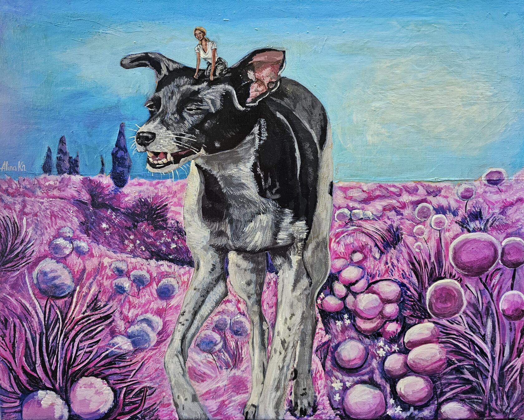 The interaction between myself and my dog is central to the painting’s emotional and symbolic depth. Perched on her head, I am not only physically elevated but also metaphorically lifted by the love and companionship we share. This dynamic creates a sense of trust and childlike wonder, emphasizing the strength of our bond. The dog’s carefree movement through the field, unrestrained and joyful, mirrors the sense of freedom that comes from being fully present in a world unburdened by worries.