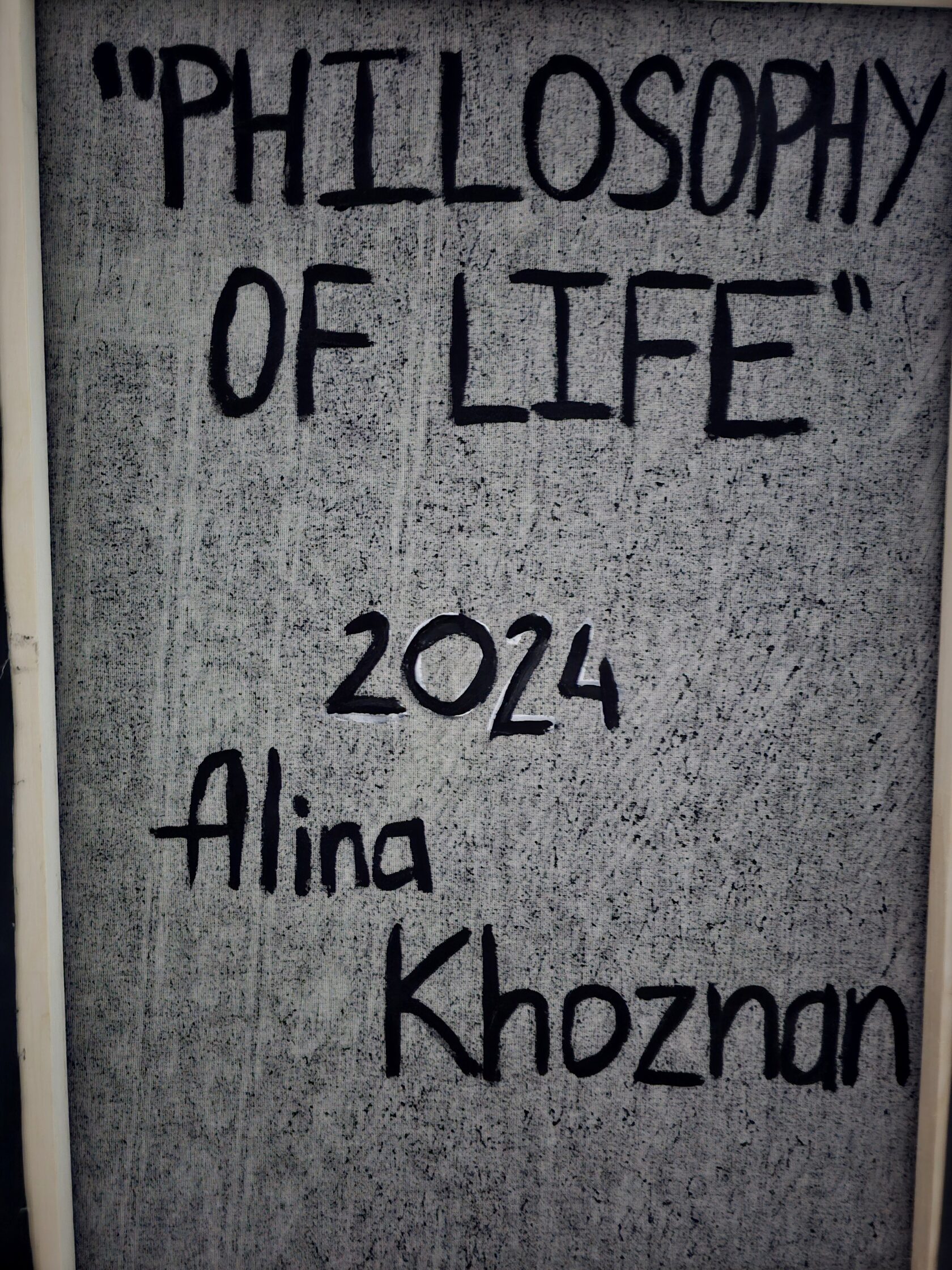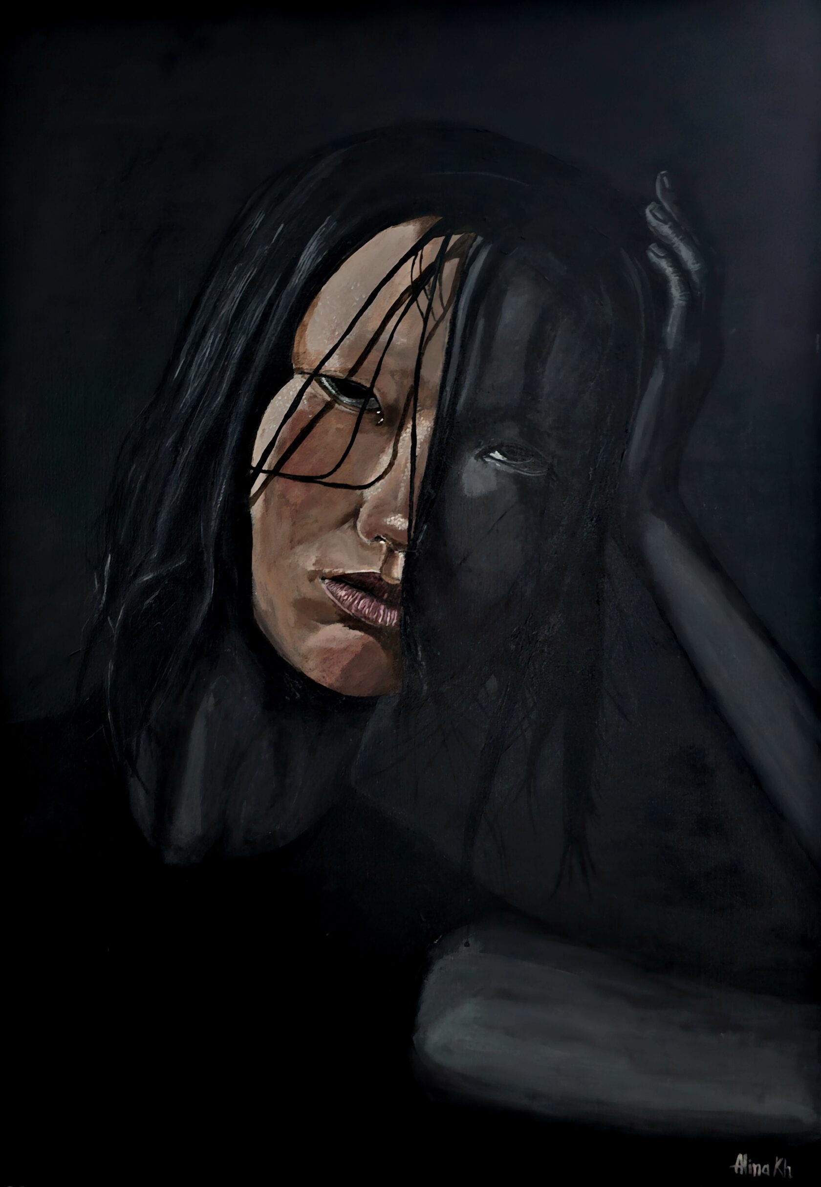 Year of creation: 2024 Varnished. Acrylics on cotton canvas. Signed with acrylics upward and backward. Size 50cm x 70 cm. The painting Philosophy of Life invites the viewer to reflect on human nature and the balance between the inner and outer worlds. The wet strands of hair falling over the face symbolize the weight of thoughts and emotions we carry, often hidden from those around us. The contrast of light and shadow across the face highlights life's duality—light and darkness, joy and pain, the visible and the concealed.