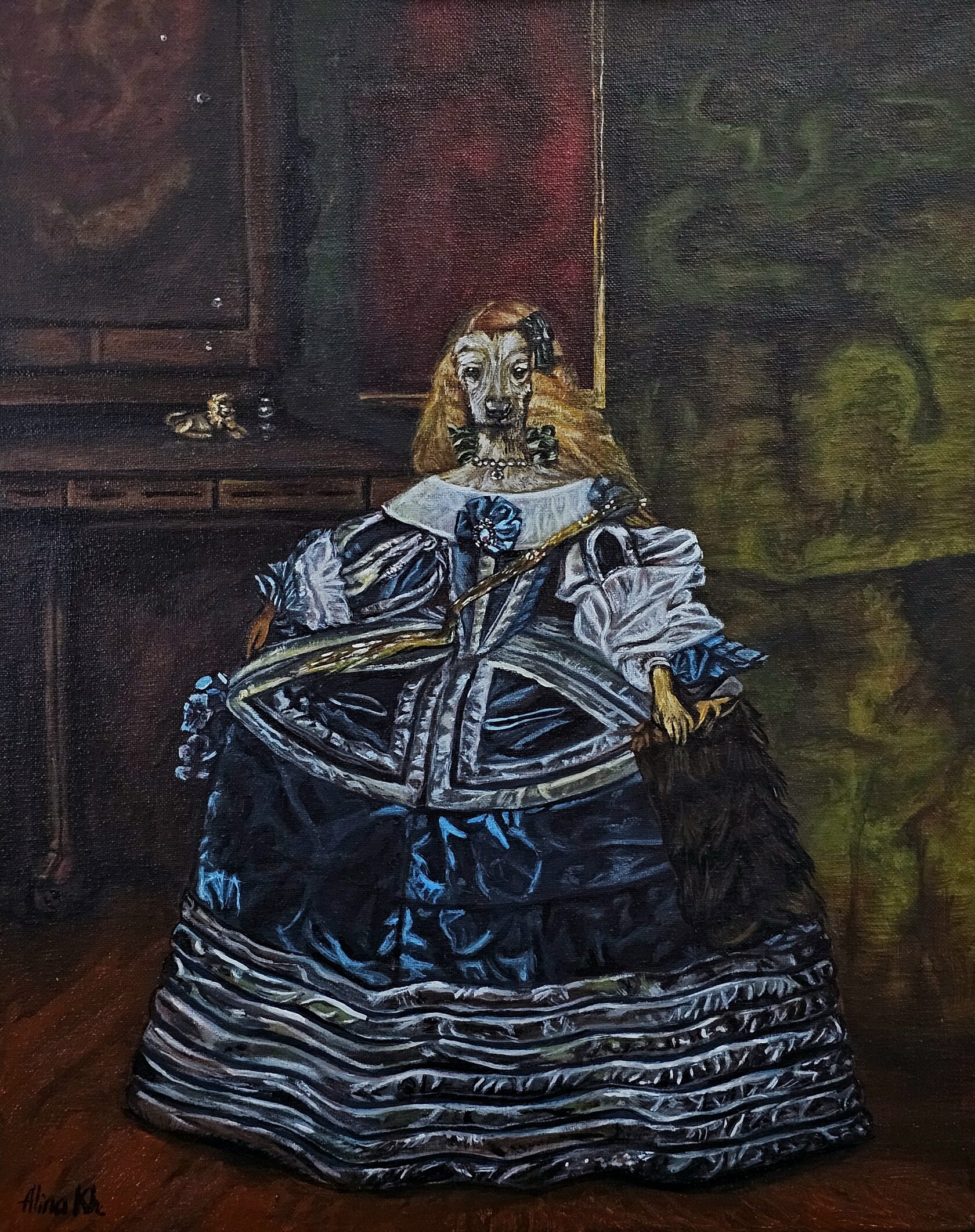 Year of creation: 2024 Varnished. Acrylics on cotton canvas. Size 40cm x 50cm. Signed with acrylics upward and backward. "Portrait of Infanta Dogonet" is a parody of Diego Velázquez's famous painting. Replacing the girl's face with that of a dog makes the artwork both amusing and thought-provoking. The dog symbolizes loyalty, simplicity, and sincerity—qualities that are far more important than status or wealth.