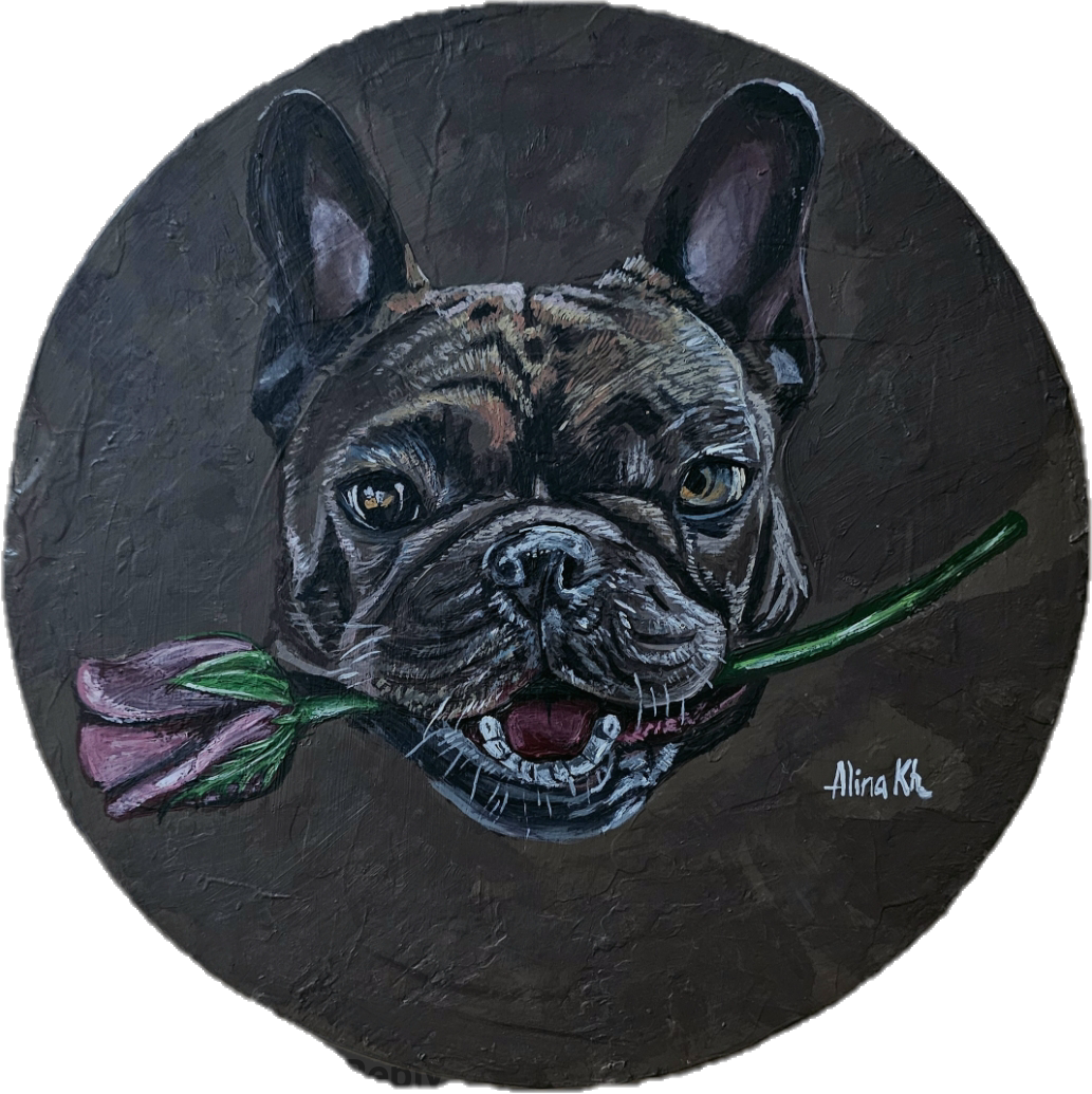 Year of creation: 2024 Varnished. Acrylics, watercolor on round wooden board. Signed with acrylics upward and backward. diameter 27.5 cm. This portrait of a chocolate-colored French bulldog on a round wooden board blends elegance with charm. The rich brown coat contrasts warmly against the wood’s natural texture, giving the piece a rustic yet timeless feel. The round shape draws the viewer’s focus, centering the bulldog as the dignified subject. The rose in its mouth adds a touch of romance, juxtaposing the breed’s muscular form with tenderness, symbolizing both strength and affection.