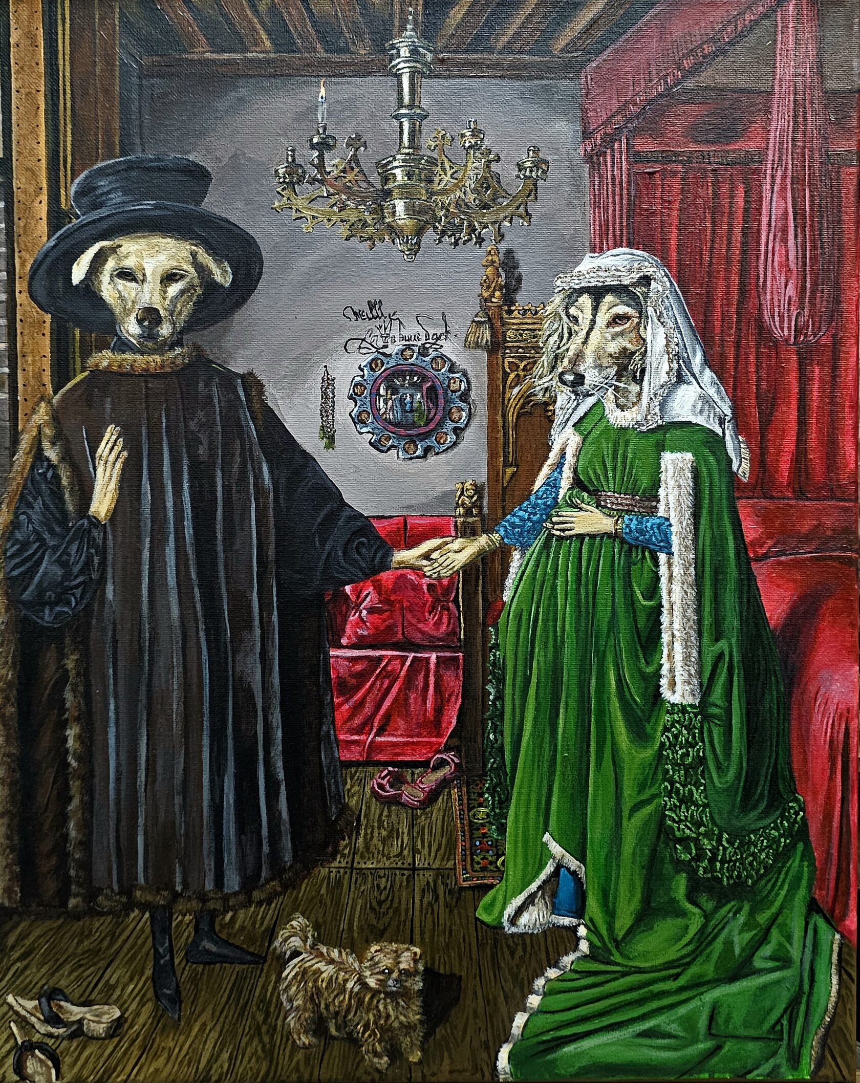 "The Dogolfini Portrait" is a parody of Jan van Eyck's iconic painting. This approach is not only humorous but also thought-provoking. The dogs symbolize loyalty, sincerity, and devotion—qualities often more important than outward luxury or social status.